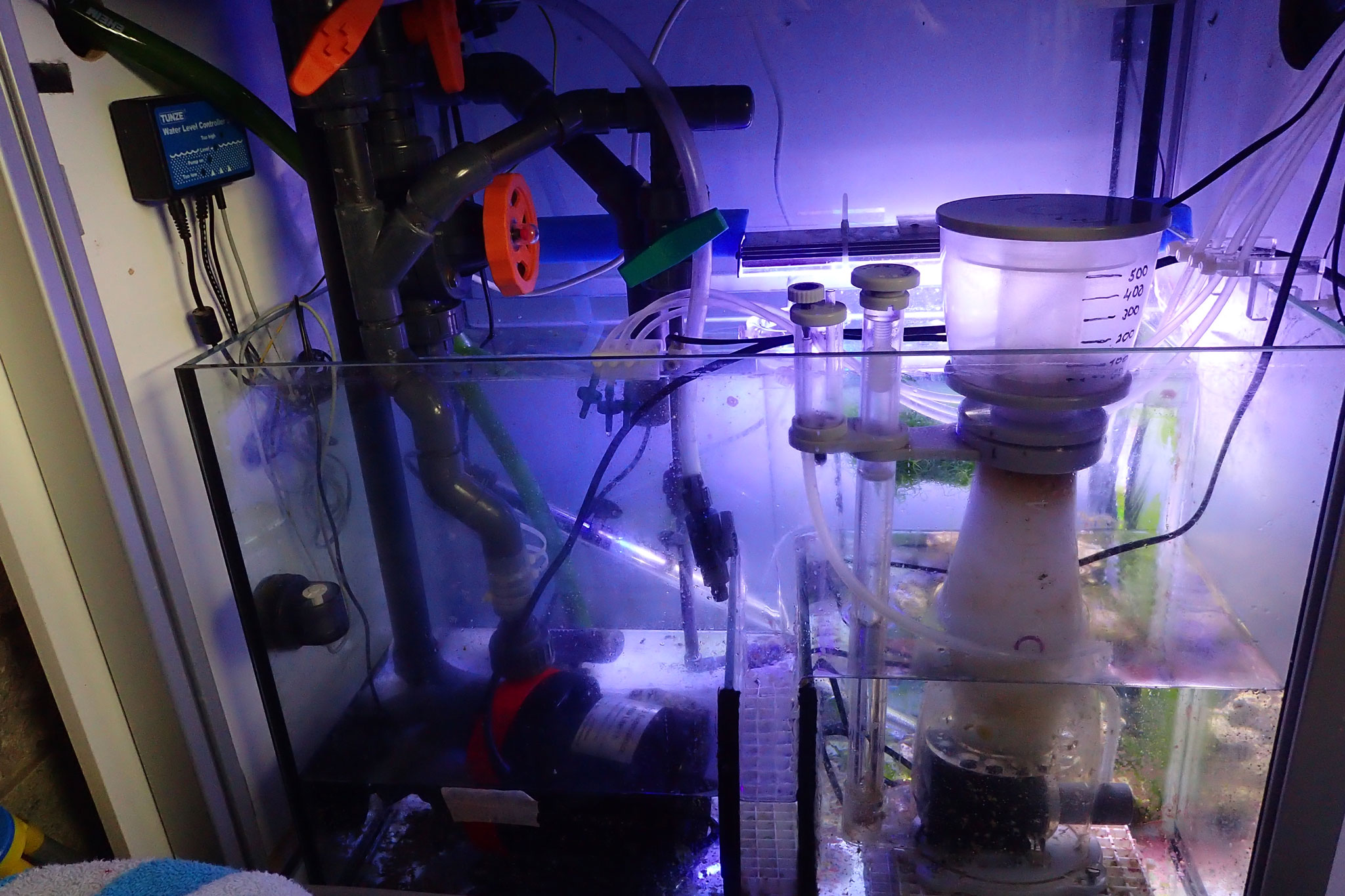 Deine Beleuchtung ist von der Gesamtkonzeption her schon recht blaulastig, die weißen LEDs sind zwar höher bestromt, aber in der Gesamtverteilung natürlich anteilig geringer. Die normal blauen fährst Du ja vermutlich auch nicht so hoch, die sind ja eh nur mit 600 mA bestromt. Schaut aber gut aus das Becken, muss jetzt nur noch alles wachsen :-) Ob dann Deine Gyre als alleinige Pumpe reicht, wird man dann schauen müssen.