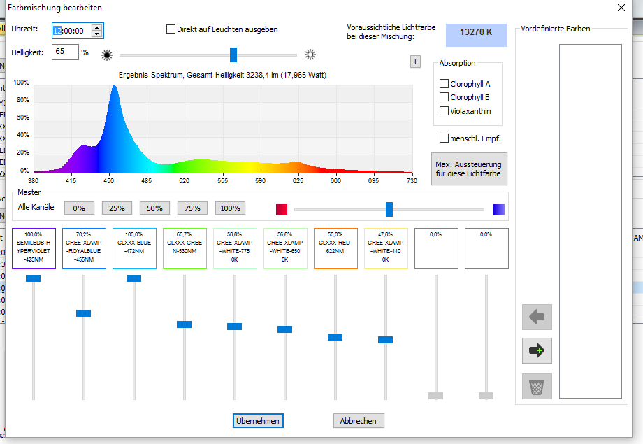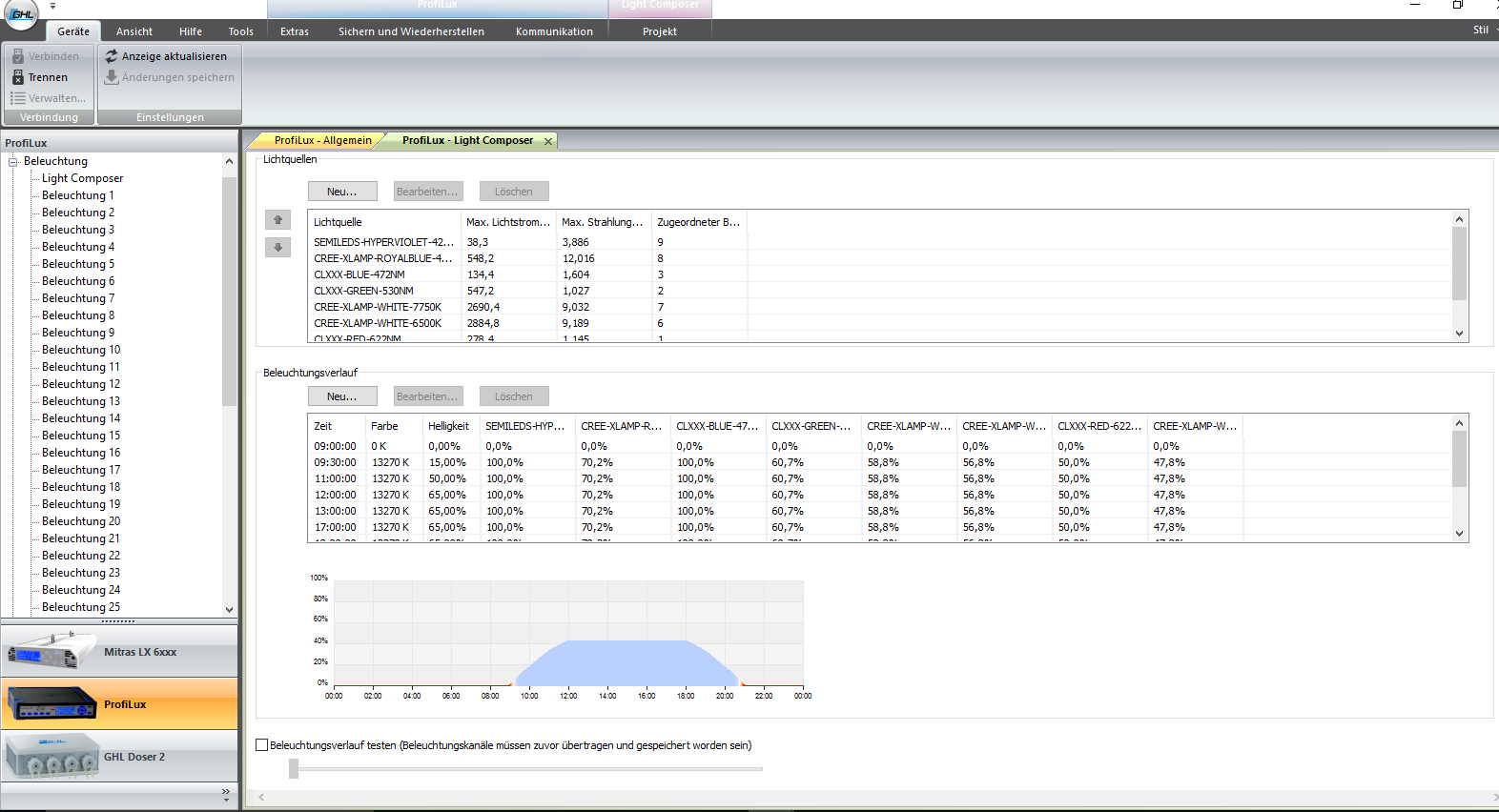 Mit der Beleuchtung spielt es sich momentan ein. Anbei zwei Übersichten der Einstellung. Es sind zwei Ocean Blue und zwei Actinic Lightbars von GHL verbaut.