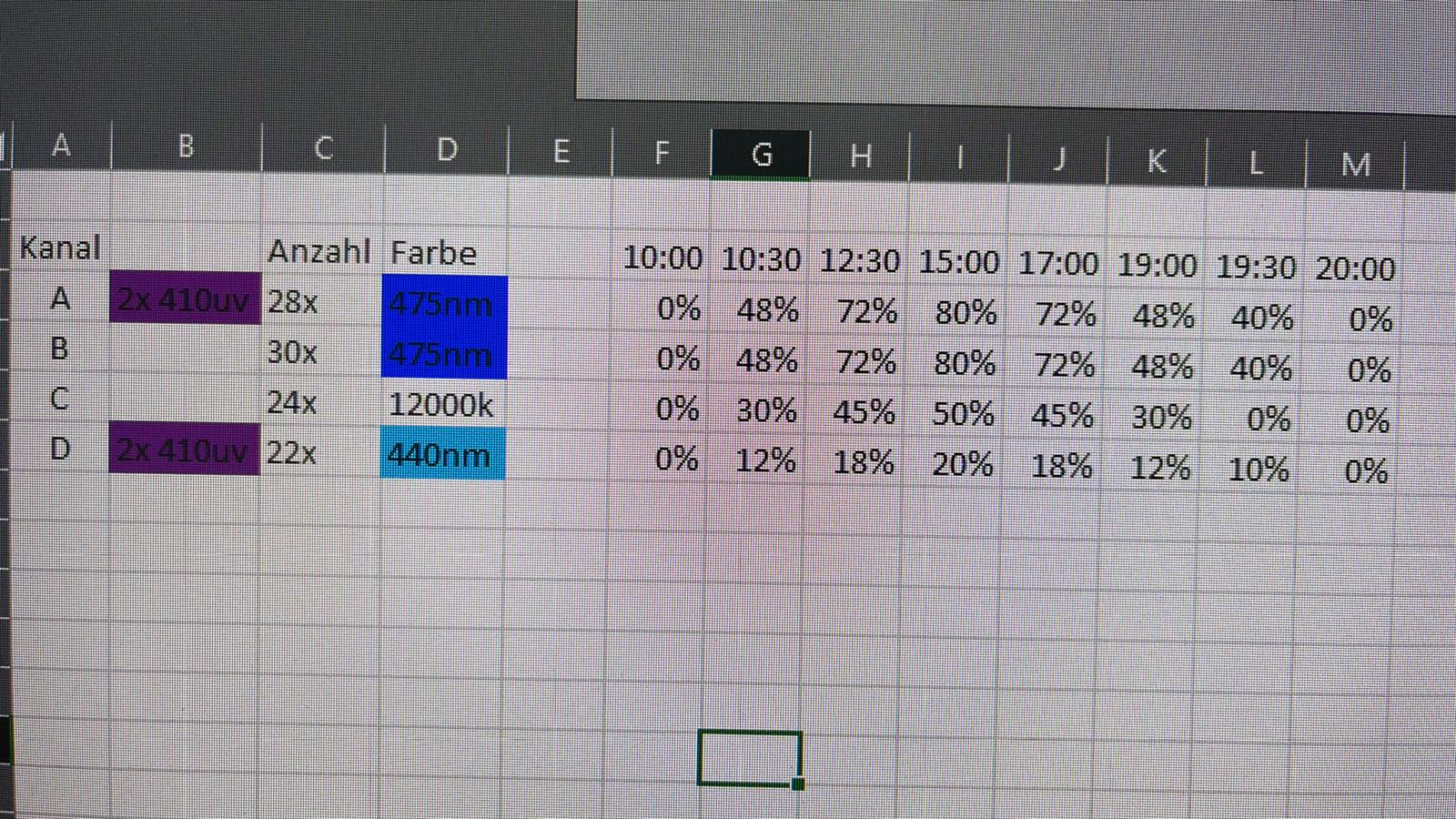 Ja, es ist zuerst mal Absicht, weil man ja nicht gleich voll beleuchten soll? Ich muß aber am Plan jetzt sowieso noch etwas ändern, weil ich zu den LED eine falsche Information hate. Die UV Leds haben gar keinen eigen Kanal, sondern sind in zwei Blaukanälen verteilt und das aber nur in eher geringem Ausmaß. Das Layout vom Hersteller hänge ich an.