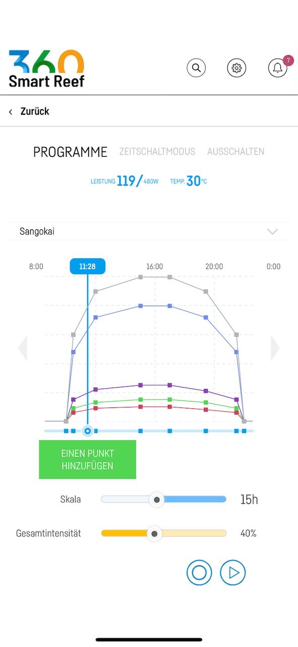 Hallo zusammen! Habe gerade mein D-D reef 1800 gestartet und habe 2 Reed Flare Pro L als Beleuchtung (31 cm über Wasser). Ich würde gerne folgendes Programm probieren - es wird ein Mischbecken. Würde das so passen ?- Die per App gemessen Beleuchtungsstärke ist zum Tagesmaximum ind der Mitte der Wassersäule unter den Lampen etwa 350 PAR. Vielen Dank und sG Florian