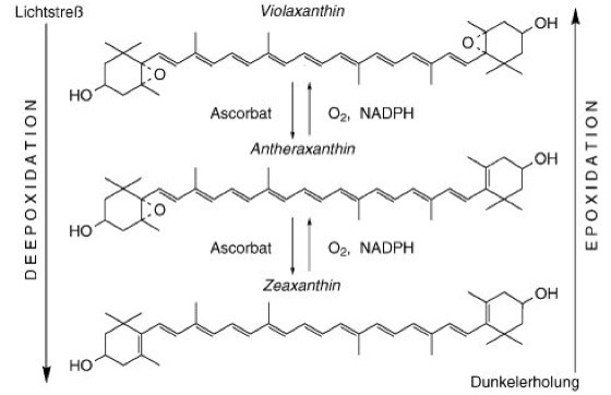 Die erwähnte Synthese ist der sog Xanthophyllzyklus. Dieser Xanthophyllzyklus ist ein Schutzmechanismus des Photosyntheseapparates der Zooxanthellen. Er hilft, überschüssige Anregungsenergie als Wärme abzuführen, bevor sich reaktive Sauerstoffspezies bilden. Dadurch werden Schäden an dem Photosystem II (PS II) minimiert. Der Zyklus steht für die reversible zweistufige Deepoxidation (Carotinoide) von Violaxanthin (Diepoxid) über das Monoepoxid Antheraxanthin zum Zeaxanthin, die in Anwesenheit von Licht enzymatisch erfolgt und dadurch einen Schutzmechanismus vor lichtbedingtem oxidativem Streß darstellt (Photorespiration). Die Rückreaktion findet dann im Dunkeln statt. Man spricht hier von dynamischer Photoinhibitation.