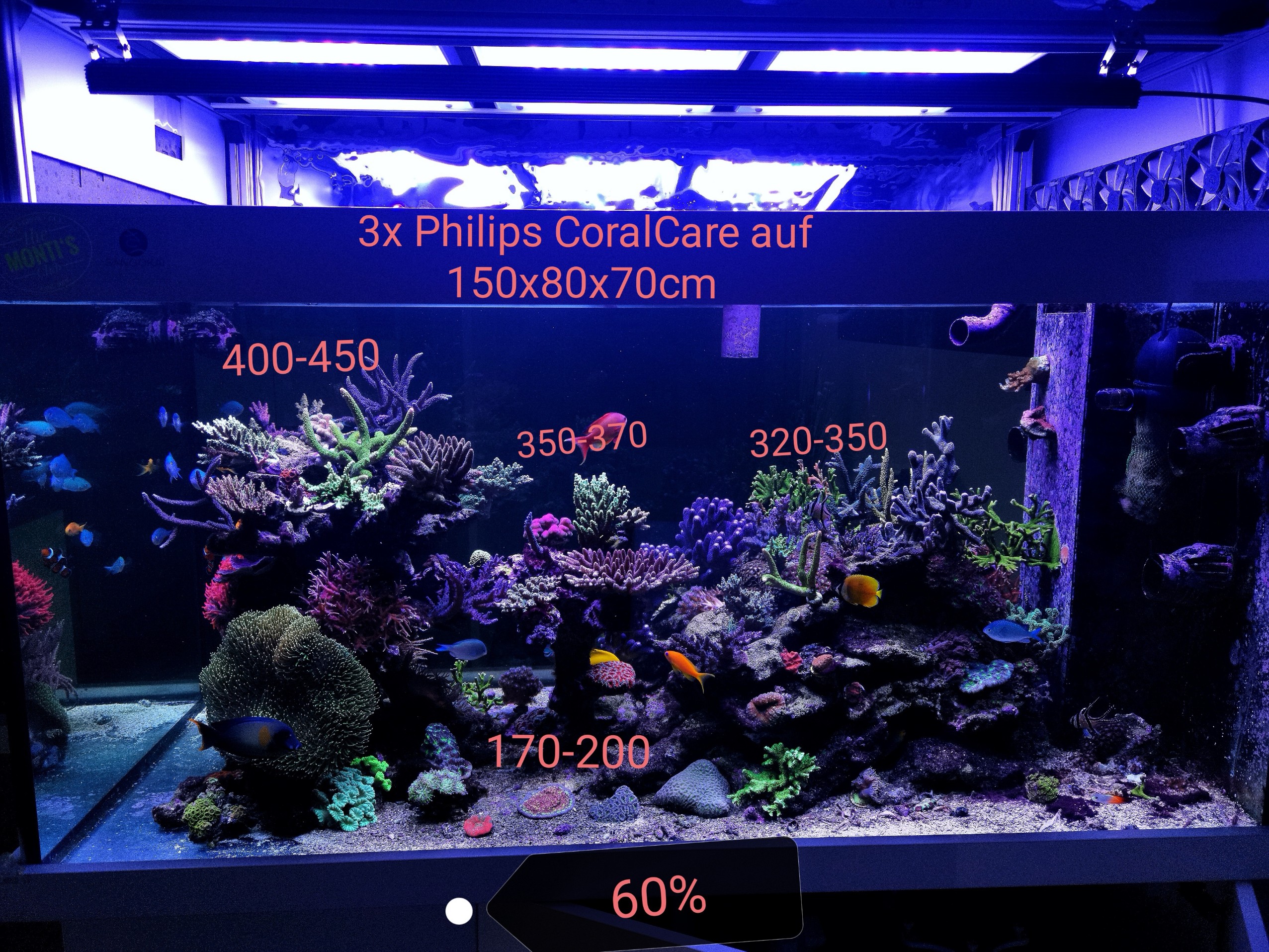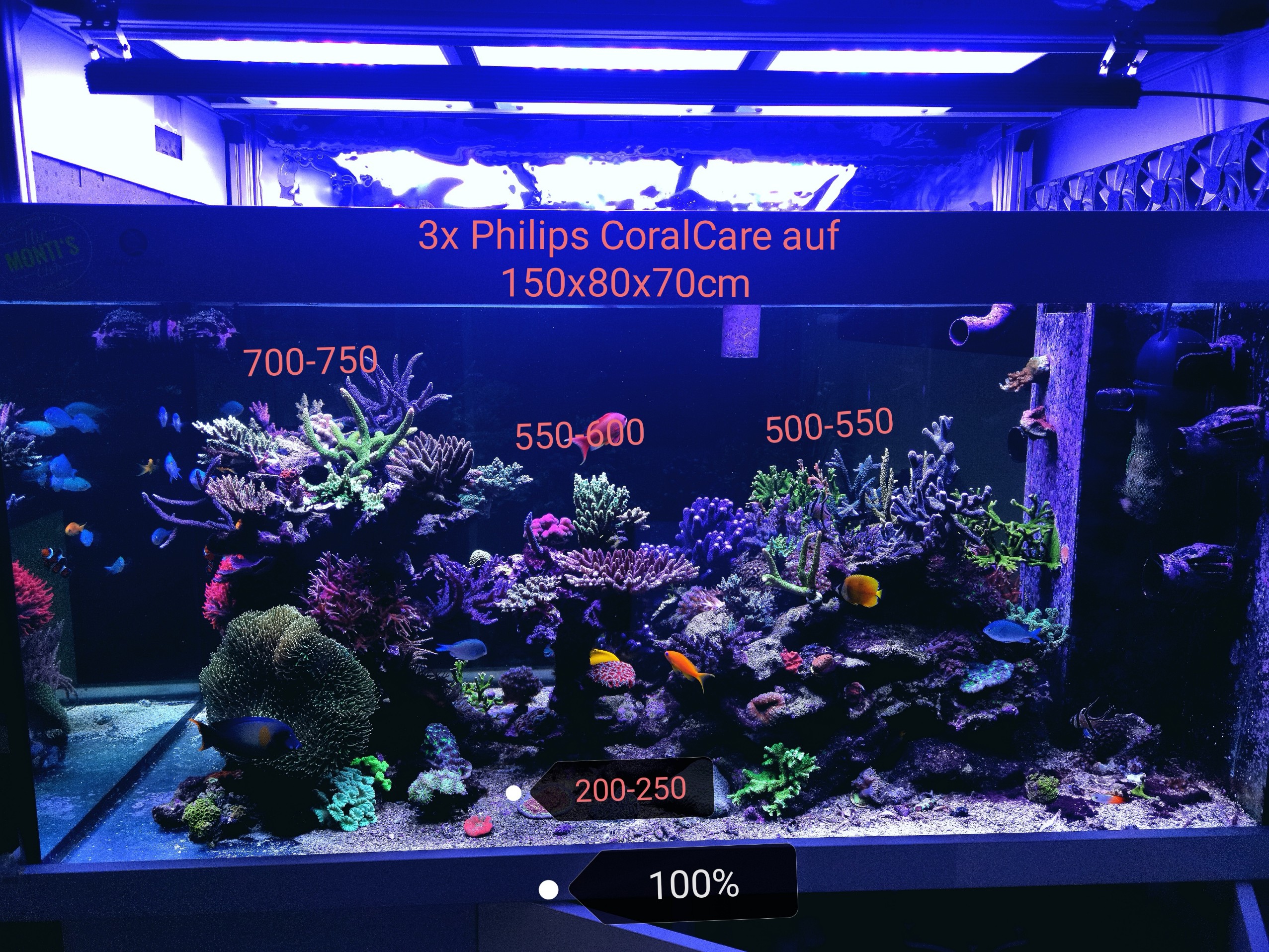 Da die Generation 2 der Coralcare etwas weniger Leistung hat und nicht groß vom Spektrum abweicht würde ich sagen das 50% für dem Anfang ok sind.