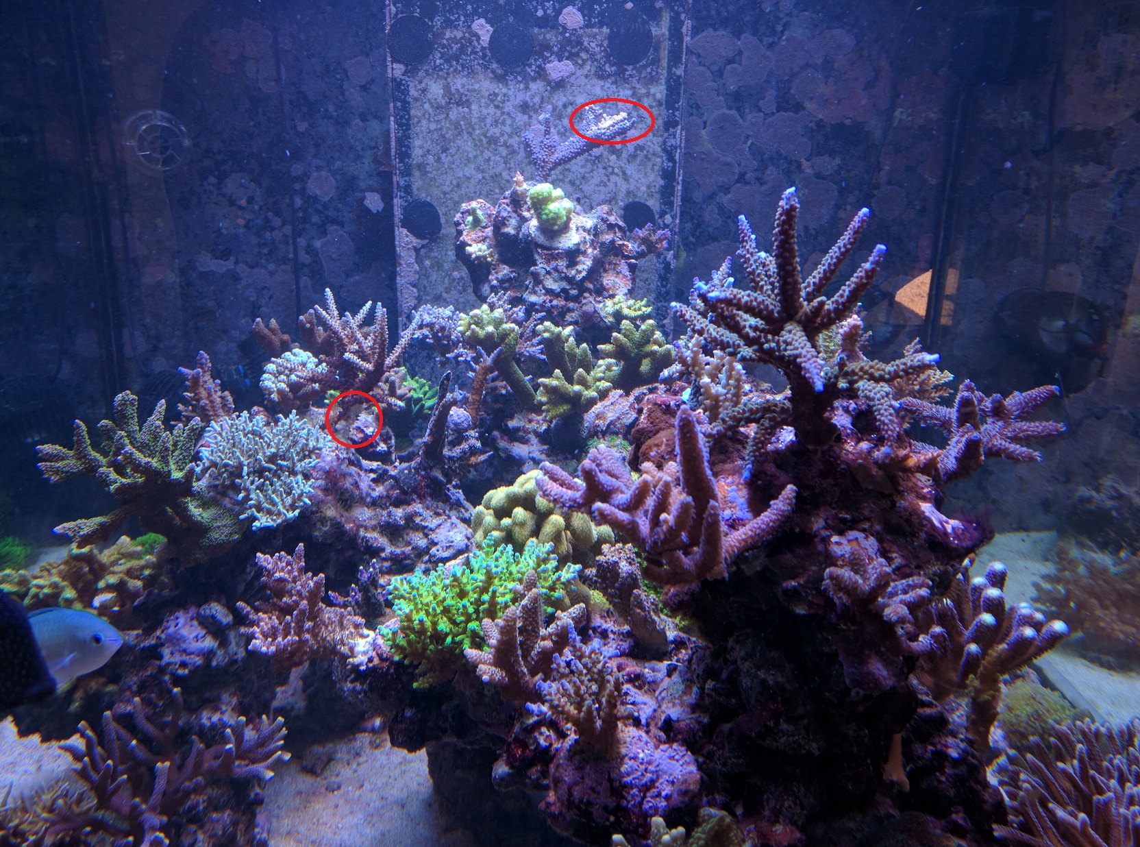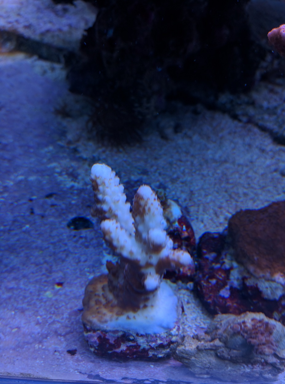 Bei der oberen blauen Acropora würde ich auf einen Gewebeverlust aufgrund von Verbrennung seitens der LED tippen.