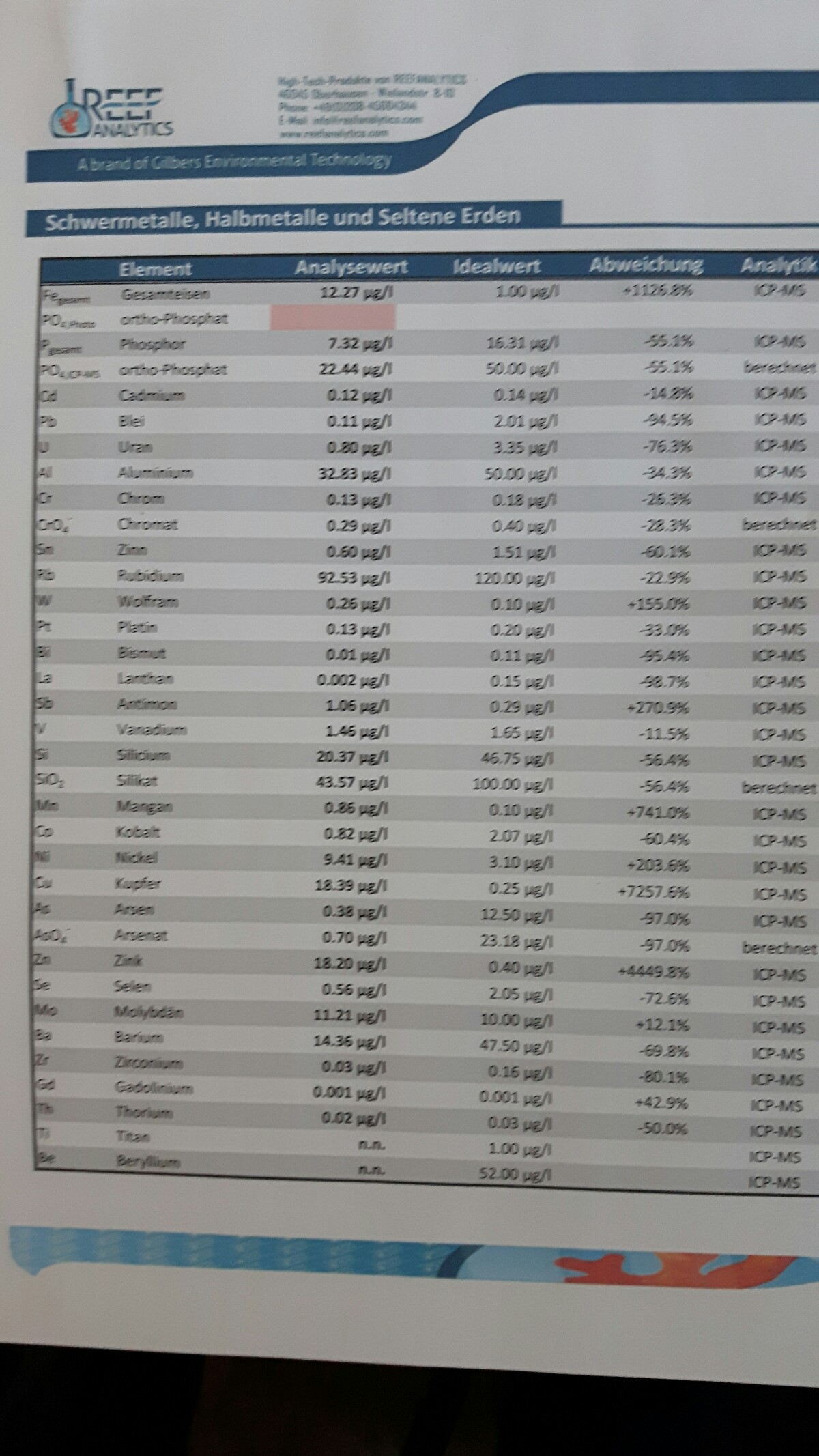 hier finde ich nur den Kupferwert auffällig. Hast du irgendwelche erkennbaren Probleme an den Korallen? Ggf. könnte man hier mit einem Wasserwechsel ein wenig gegensteuern.