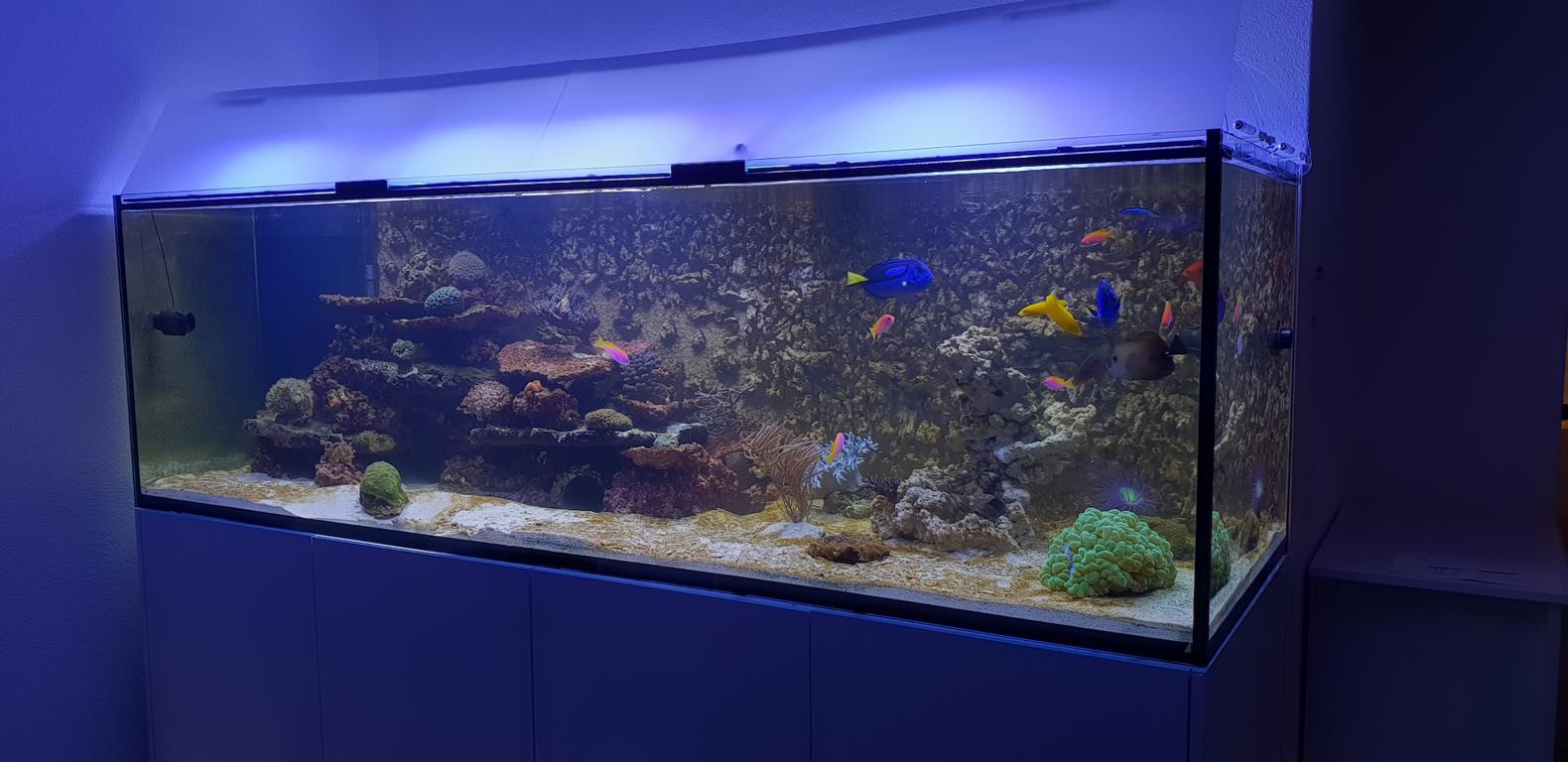 Nachfolgend ein paar aktuelle Fotos. Das Wasser ist nach kleinen Änderungsarbeiten am Filter gerade etwas trübe, was ein paar Stunden später schon wieder schön klar war. Die Kieselsäure ist langsam aber sicher verbraucht und die bräunlichen Kieselalgen sind auf dem Rückzug. Die nächste (mögliche) Stufe mit den grünen Fadenalgen steht somit vor der Tür. Bin schon mal gespannt was da auf uns zukommen wird. Die Einsiedler, Schnecken, Seeigel, die Docs und der Borstenzahn warten schon mit Freude darauf :D Das Licht ist mit 4x Gnc Blue-Ray 130 W LED Lampen ausgerüstet und läuft zur Zeit mit 65%.