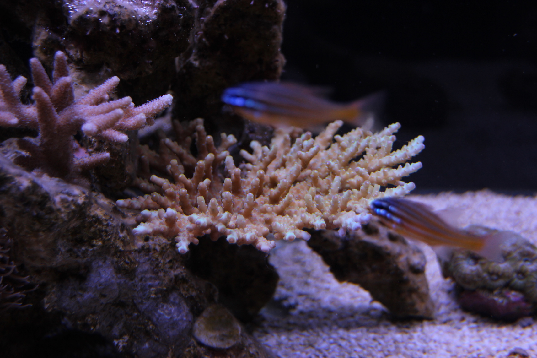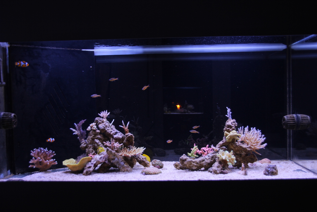Mittlerweile sind vier überlebende Fische im neuen Becken eingezogen die sich sichtlich wohl fühlen. Nur die Korallen wollen noch nicht wirklich. Vielleicht brauchen Sie einfach ein paar Tage um sich an das Licht zu gewöhnen.