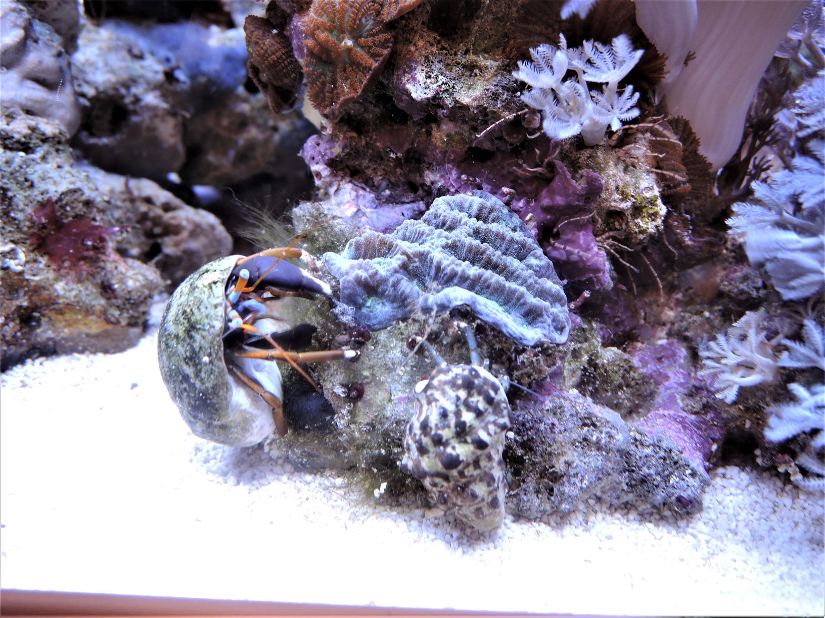 Ich habe den veralgten Stein herausgenommen und die Algen mit Wasserstoffperoxid betropft, kurz einwirken lassen, gründlich abgespült und zurück ins Aquarium gestellt. Siehe da, plötzlich interessieren sich die Einsiedler doch dafür.