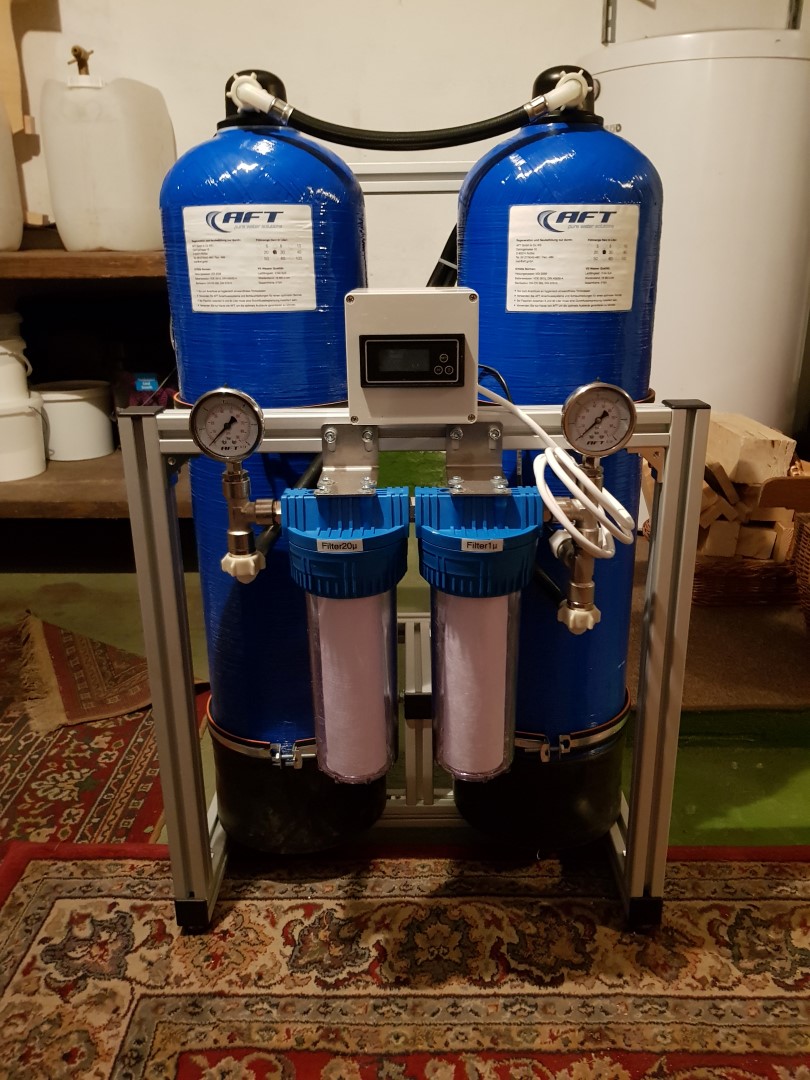 Somit bleibt nur noch eins übrig: Eine Mischbettharz-Anlage. Wir haben uns erkundigt und eine Firma in unserer nähe gefunden die solche Anlagen fertigt und auch die Harze regeneriert. An der Anlage ist ein Leitmessgerät angeschlossen, das einen Alarm gibt wenn der eingestellt Wert erreicht wird.
