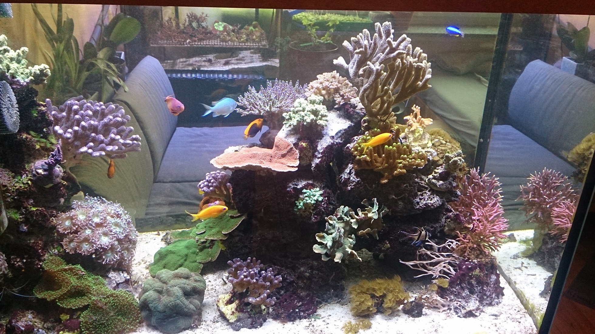 Man sieht wie die meisten Korallen gut stehen, manche Acropora aber Probleme mit ihrer Farbigkeit haben. Ich hoffe das wird mit sinkendem Phosphatwert besser.