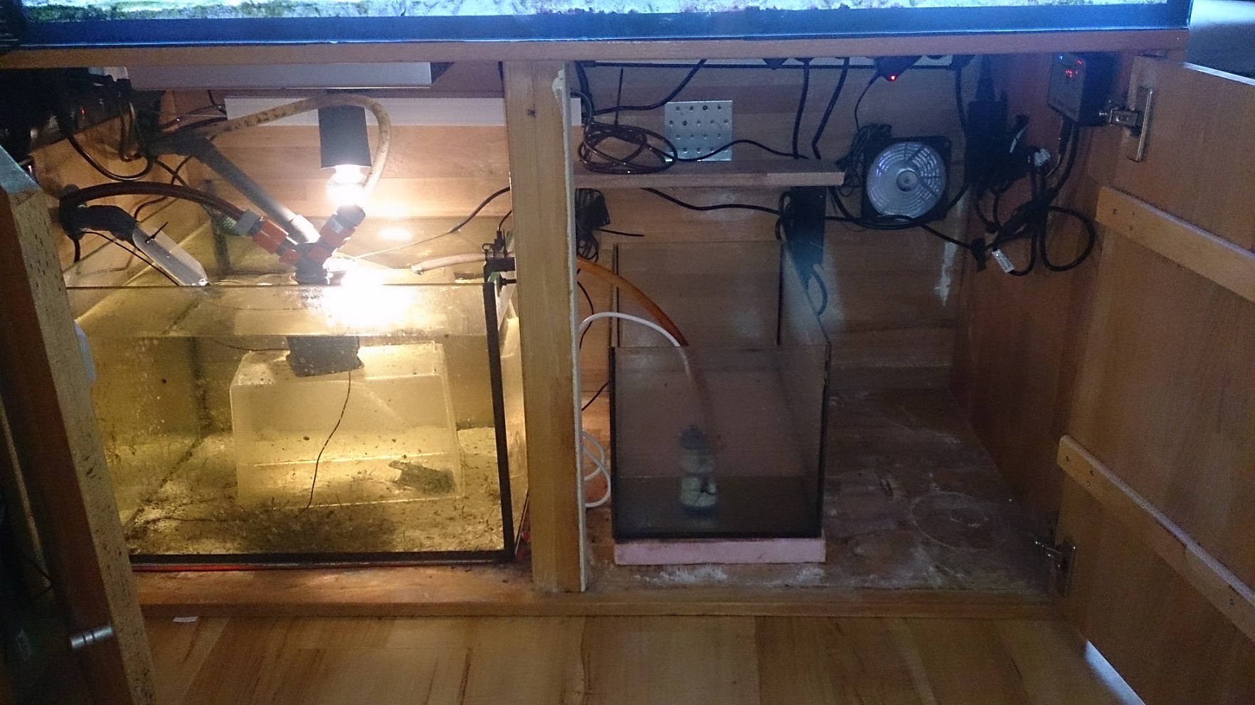 der Unterschrank mit dem Technikbecken, welches ansich nur noch die Nachfüllung beherbergt und zur Verbindung von Haupt- und Ablegerbecken dient. Entsprechend ist der Wasserdurchsatz durch diese beiden Becken jeweils nur noch 150l pro Stunde.