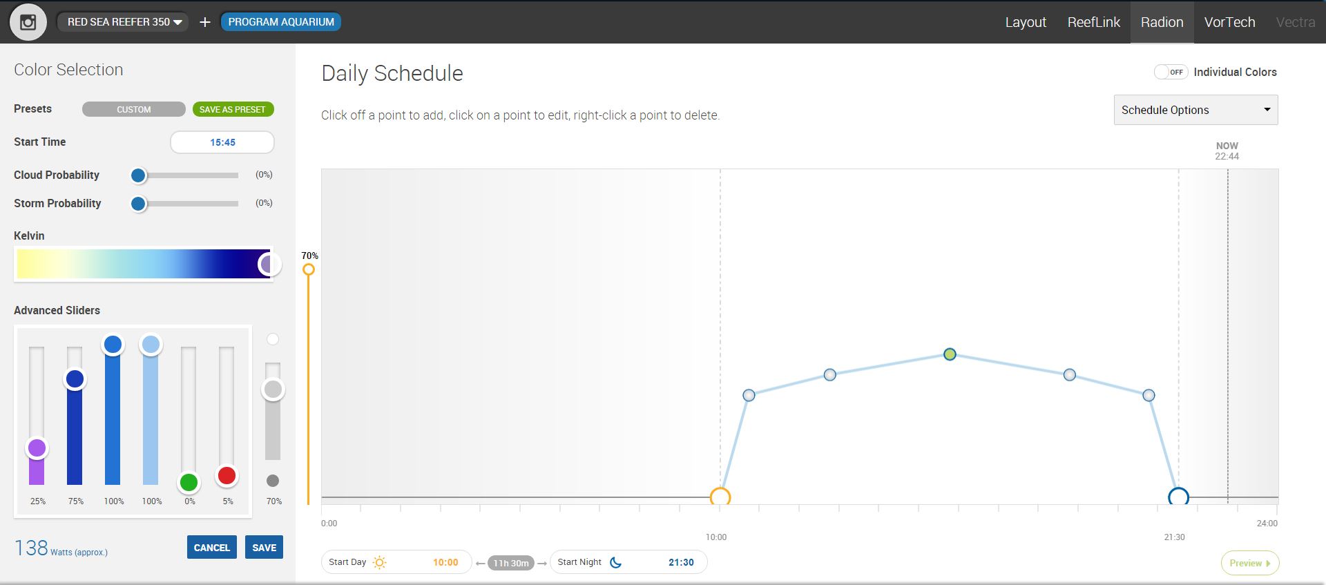 In einem anderen Thread hier habe ich das PDF mit den neuen Lampenprofil Empfehlungen gesehen. Ich habe mal das Profil für 11,0 – 11,5 Stunden beispielhaft für meine Lampen übernommen und wollte von dir wissen, ob ich das so richtig gemacht habe. Dazu sei gesagt, dass ich mit meinem alten Profil meiner Meinung nach keine großen Probleme hatte. Allerdings waren bei mir viel längere Dimmphasen gegeben, diese auch eher Blaulastig. Auch eine Mondphase mit 1% Blaubeleuchtung war dabei. Von dem neuen Profil verspreche ich mir eine geringere Strahlungsbelastung für meine Korallen, vielleicht dankt mir meine zickende Goniopora das ebenfalls.