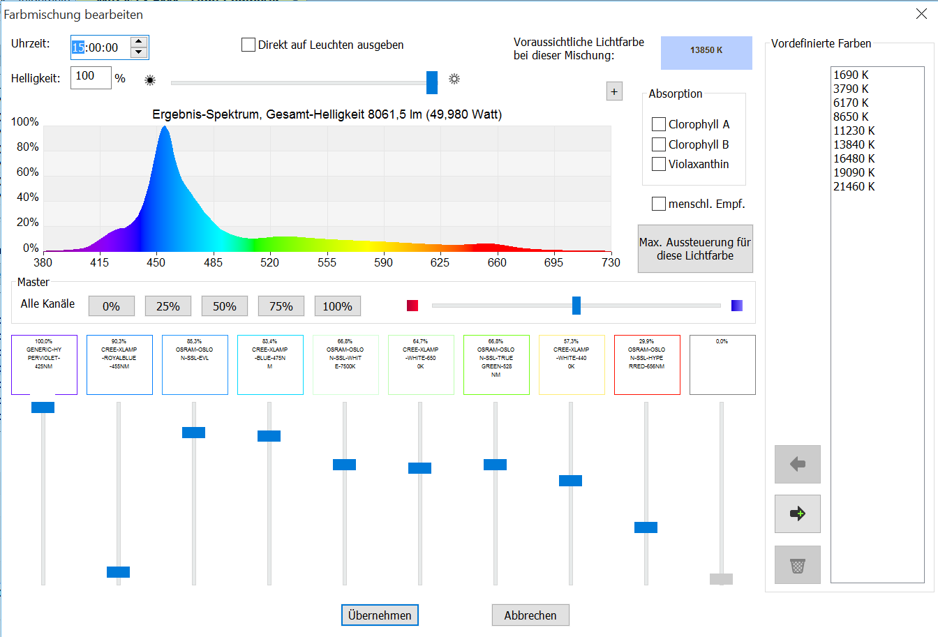 Den kann ich individuell einstellen. Da kann ich eine Uhrzeit definieren und einstellen welcher Kanal wie stark leuchten soll und dann ins Summe auch noch wie stark.