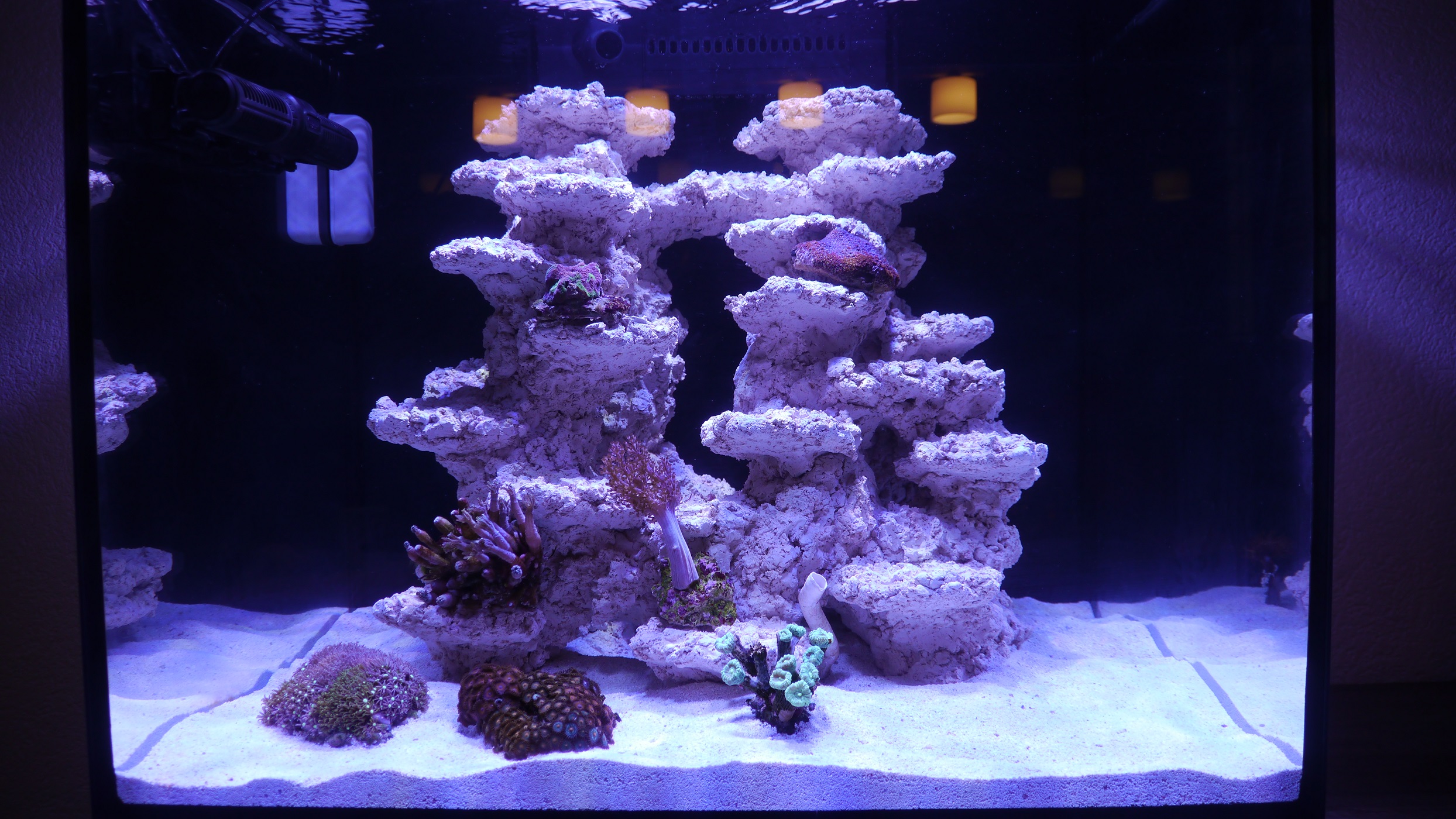Wichtig ist nur, dass Du den vielen Siedlungsraum auch mit Korallen besetzt. Dein Aufbau ist extrem hoch, aber das hatte ich ja schonmal gesagt glaube ich, und es ergibt sich darüber eine Menge Platz, den Du ökologisch kontrollieren musst (d.h. besetzen musst!). Vor allem im oberen Bereich musst Du mit der Strahlungsintensität aufpassen, Dir wird da vermutlich schnell eine Koralle verbrennen und die im unteren Bereich bekommen wiederum zu wenig Licht. Daher ist ein so übertrieben hoher Aufbau sehr nachteilig. Aber okay, das kann man jetzt nicht mehr ändern.