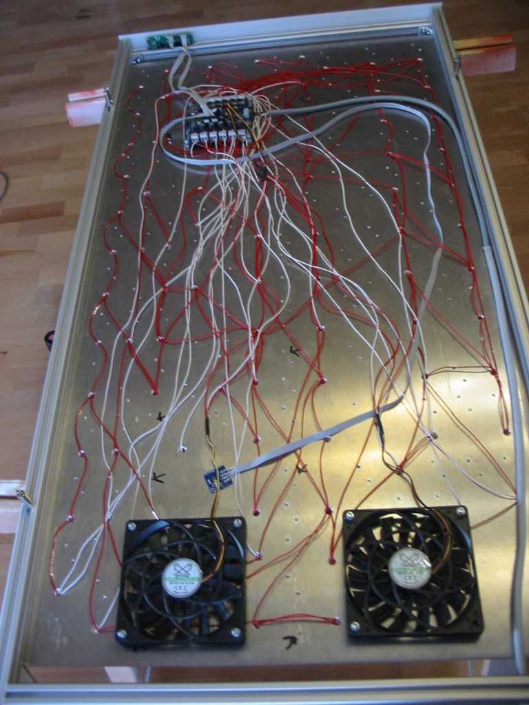 Meine Lüfter sind mit leichtem Abstand auf dem Blech montiert und jeweils zwischen zei lüftern sind die Platinen verschraubt. Dieser Luftstrom reicht bei mir völlig aus. Eventuell sind Deine Lüfter auch zu klein.
