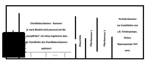 Anbei mal ein Technikbecken, wie ich sie konzeptionell aufbaue. Rechts ist ein Refugium, das ist optional. Ich verwende ein Einlaufkompartiment/Schacht, da saugt der Abschäumer dann direkt an, der steht in dem großen Technik-Kompartiment, zusammen (aber räumlich dahinter) kann man Fliessbettfilter einbringen, von da läuft es über in die Klarwasserkammer, da liegt dann der Heizstab, die Rückförderpumpe und die Wasserniveau-Technik. Mehr braucht es nicht für ein gut funktionierendes Technikbecken.
