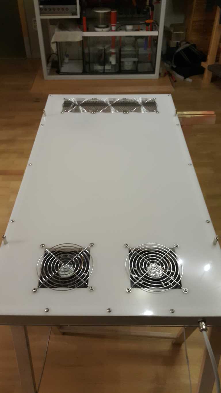Meine Lüfter sind mit leichtem Abstand auf dem Blech montiert und jeweils zwischen zei lüftern sind die Platinen verschraubt. Dieser Luftstrom reicht bei mir völlig aus. Eventuell sind Deine Lüfter auch zu klein.