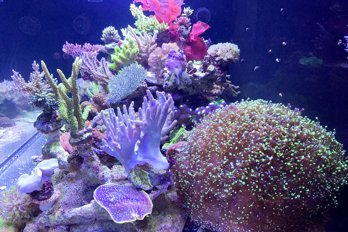 Ansonsten gibt es nicht viel zu berichten, hie und da a bisserl Korallen aufgestockt und umgestellt, ein paar Riffäste verbaut. Die letzten Wochen über wächst bei mir ziemlich viel Meersalat, eine Art Ulva, nur in rot. Die Teile sind teilweise so groß geworden, dass ich sie kappen musste und hab sie an die Seitenwand mit einem Magneten befestigt. Schaut ja eigentlich sehr dekorativ aus, aber wenn die Korallen immer abgeschattet sind....