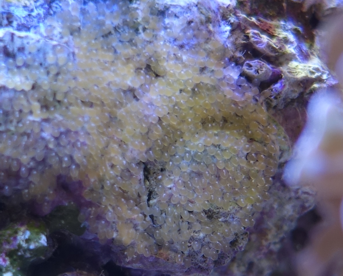 Gestern konnte ich das erste Mal beobachten, wie meine beiden Clownfische neben ihrer Euphyllia gelaicht haben.