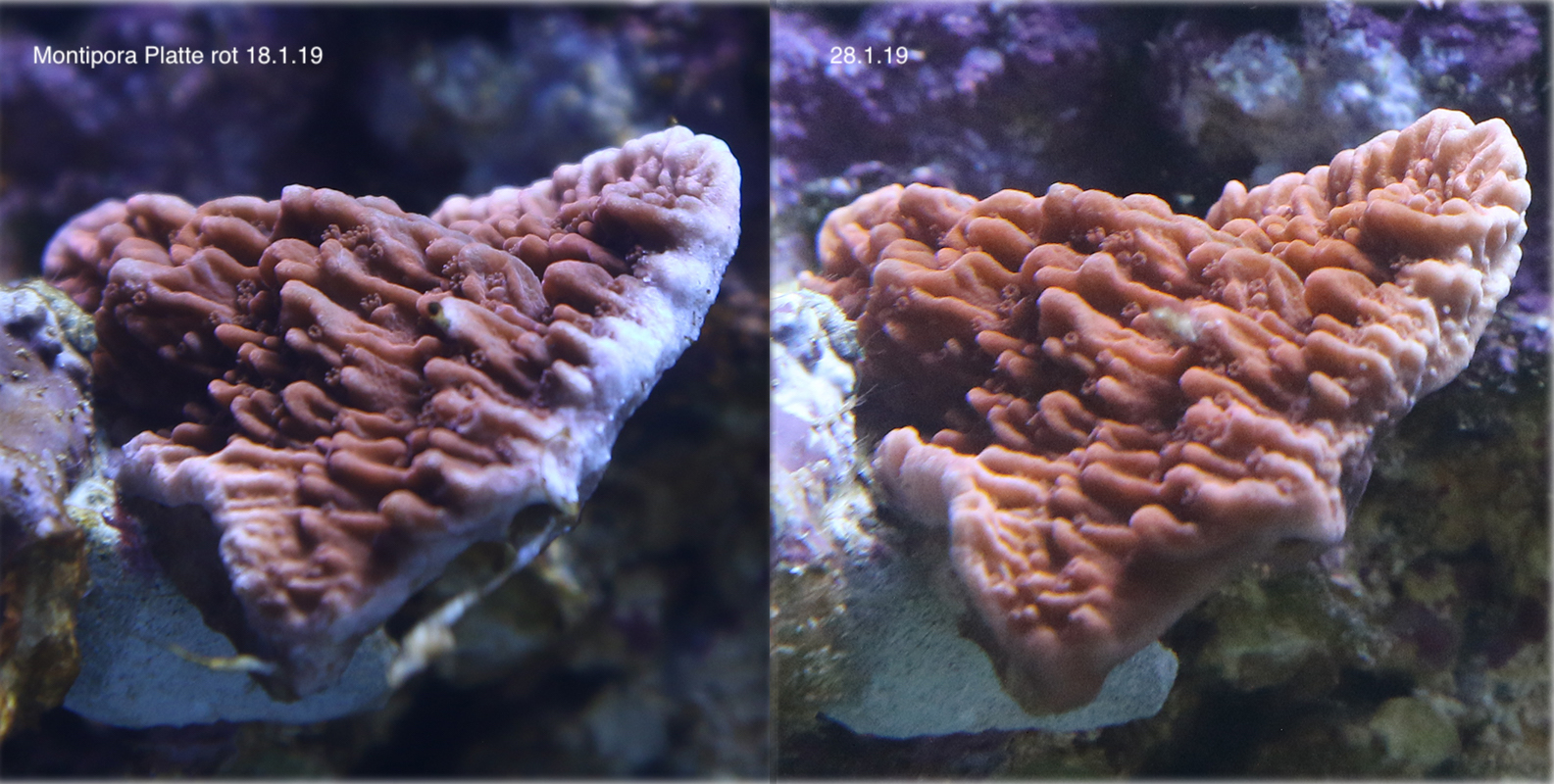 die Bryopsis kann ich noch nicht einschätzen. Ich bin ja noch in der "Einlaufphase"; das Becken steht ja erst seit einem Monat. Muss ich da schon zu drastischen Mitteln greifen, oder kann sich das durch die langsam aufbauende Nährstoffkonkurrenz durch die Korallen und mechanische Entfernung quasi von "selbst" erledigen? Dass die Korallen wachsen ist unbestritten (siehe Bilder), aber noch sind das ja alles kleine "Pimpfe".