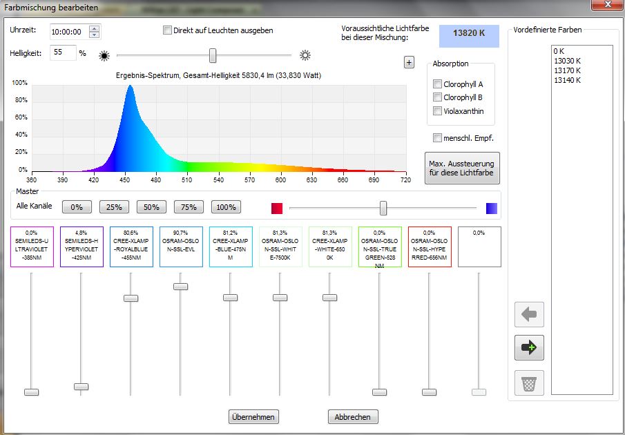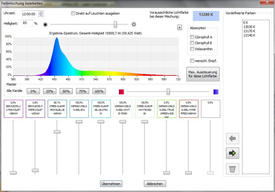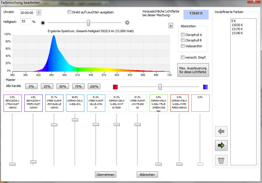 Beginn der Beleuchtung ist um 9.00 Uhr, dann wird bis um 10.00 Uhr auf 55%, bis um 12.00 Uhr auf 85%, bis um 15.00 Uhr auf 95% Hoch gedimmt. Ab 15.00 Uhr bis 18.00 Uhr wieder auf 85%, bis 20.00 Uhr auf 55% und bis 21.00 Uhr auf 0% Herunter gedimmt.