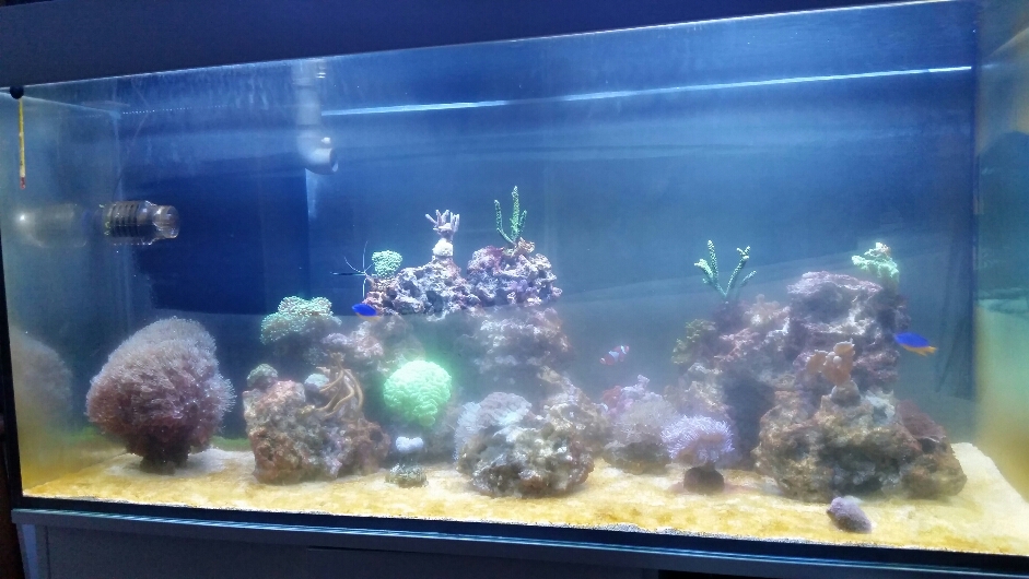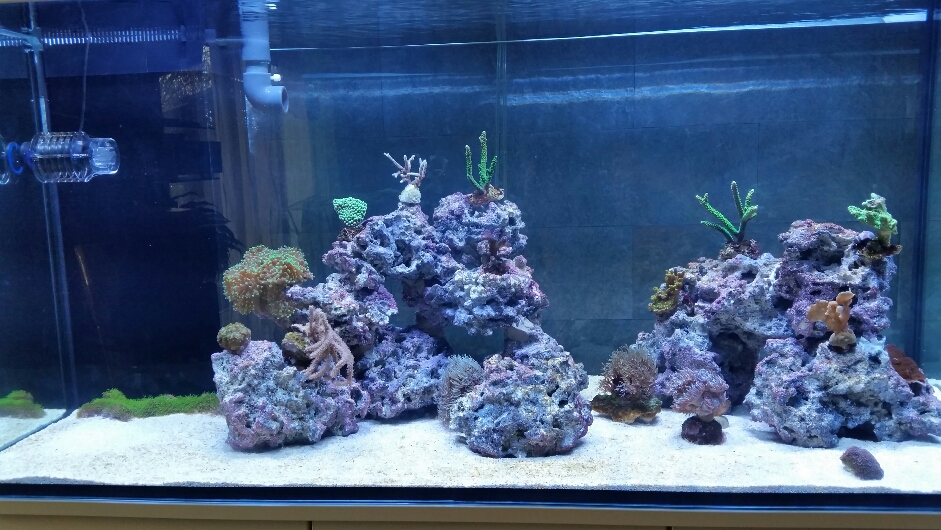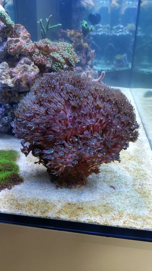 Im Becken sind (vermutlich) die Kieselalgen am Werk und an die Scheiben werden vom einem grünbraunen Belag überzogen! Ich Denke aber das dass zur Einlaufphase gehört. Die Korallen sind alle soweit offen, bis auf die Gorgonie.