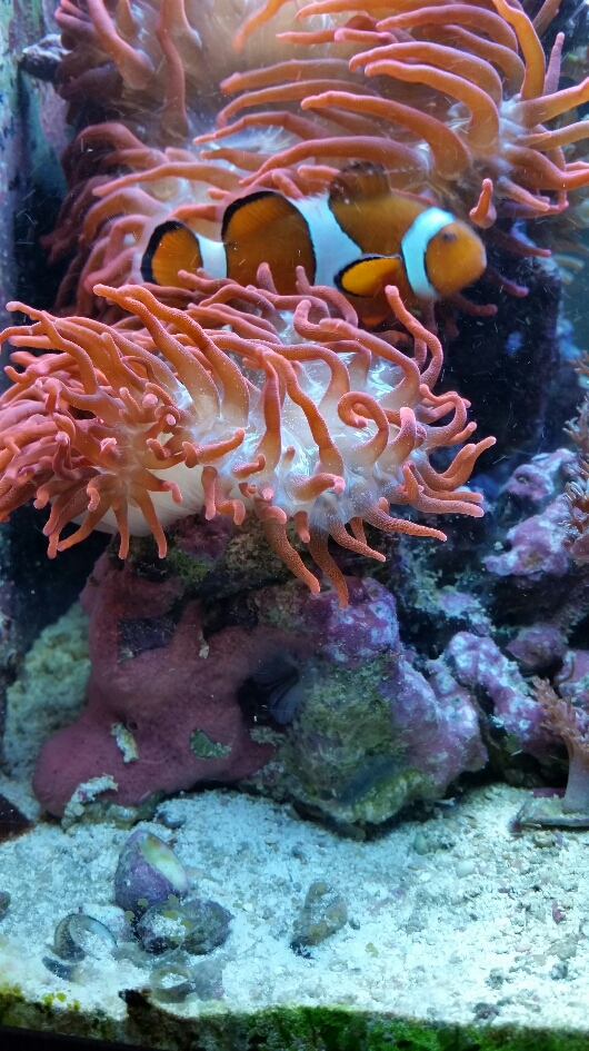 Am Sonntag habe ich unsere zwei Amphiprion ocellaris und die dazu gehörende Anemone ins Becken umgesetzt dazu noch die zwei Weißbandputzergarnelllen, hat soweit alles ganz prima geklappt und es haben sich alle gleich vertragen.
