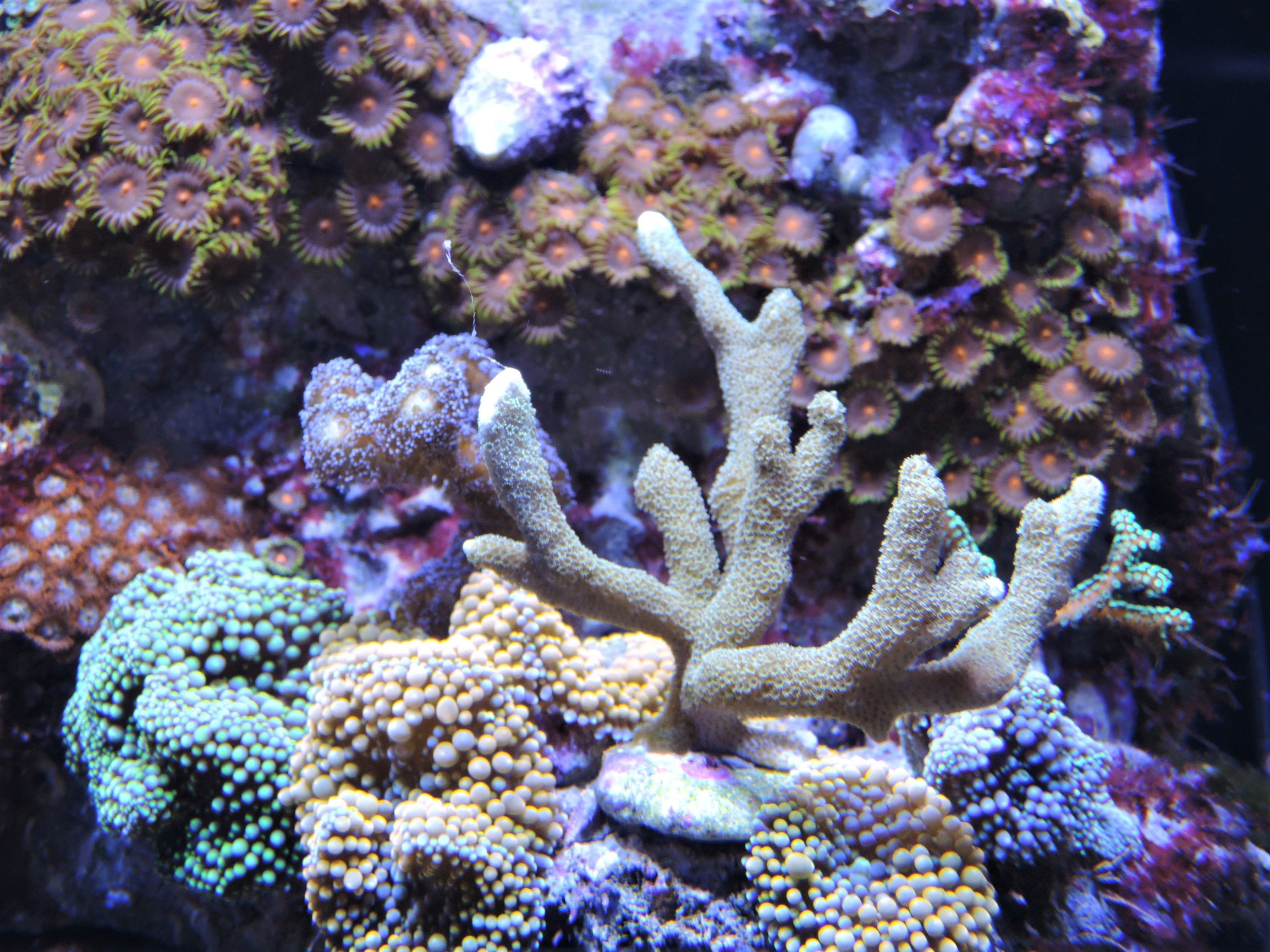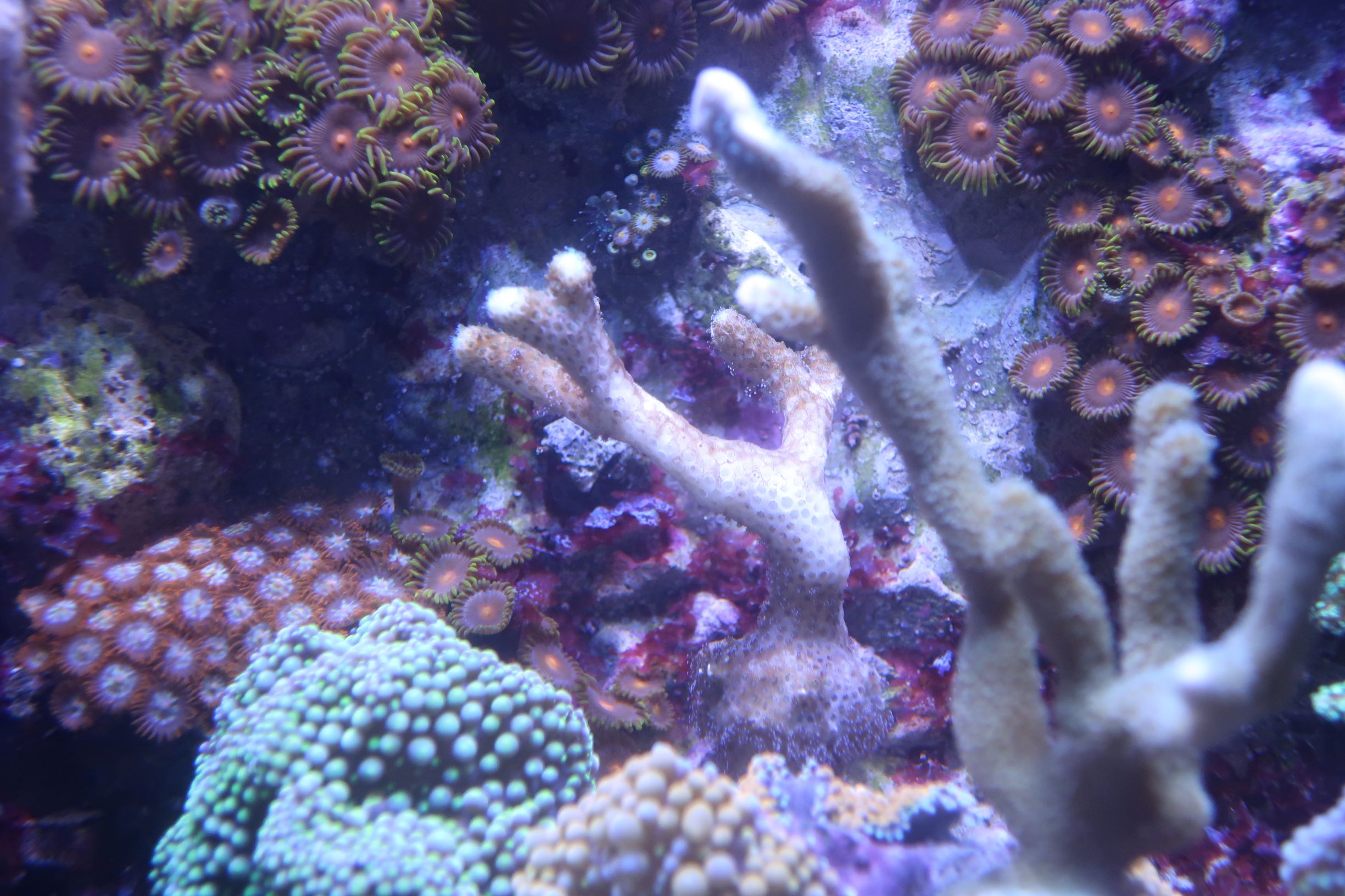 Eine Pocillopora ist in der Zwischenzeit leider gestorben, alle anderen Korallen leben noch. Farblich sehen sie allerdings nicht so schön aus.