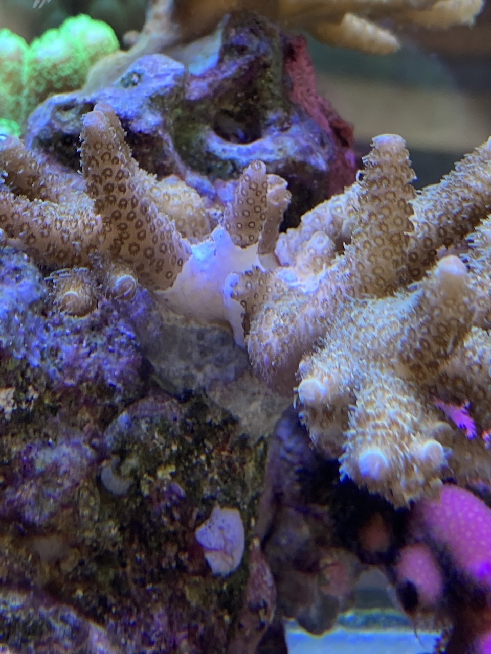 Übrigens diese SPS scheint sich zu regenerieren..bei dem letzen Bild von ihr war das Gewebe weiß …