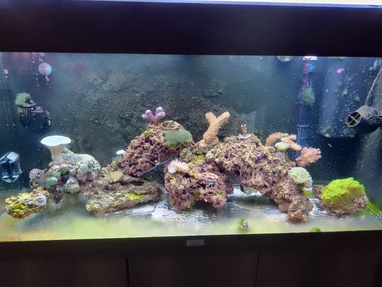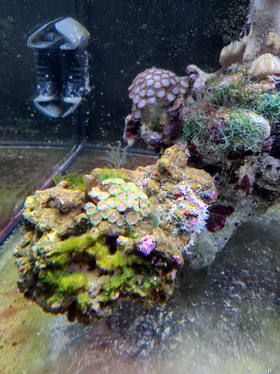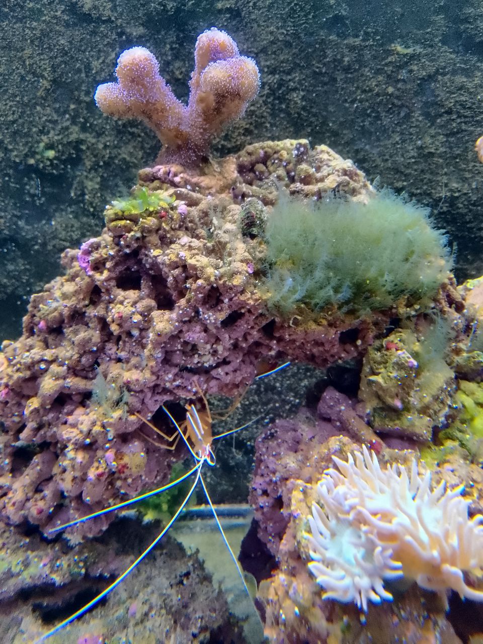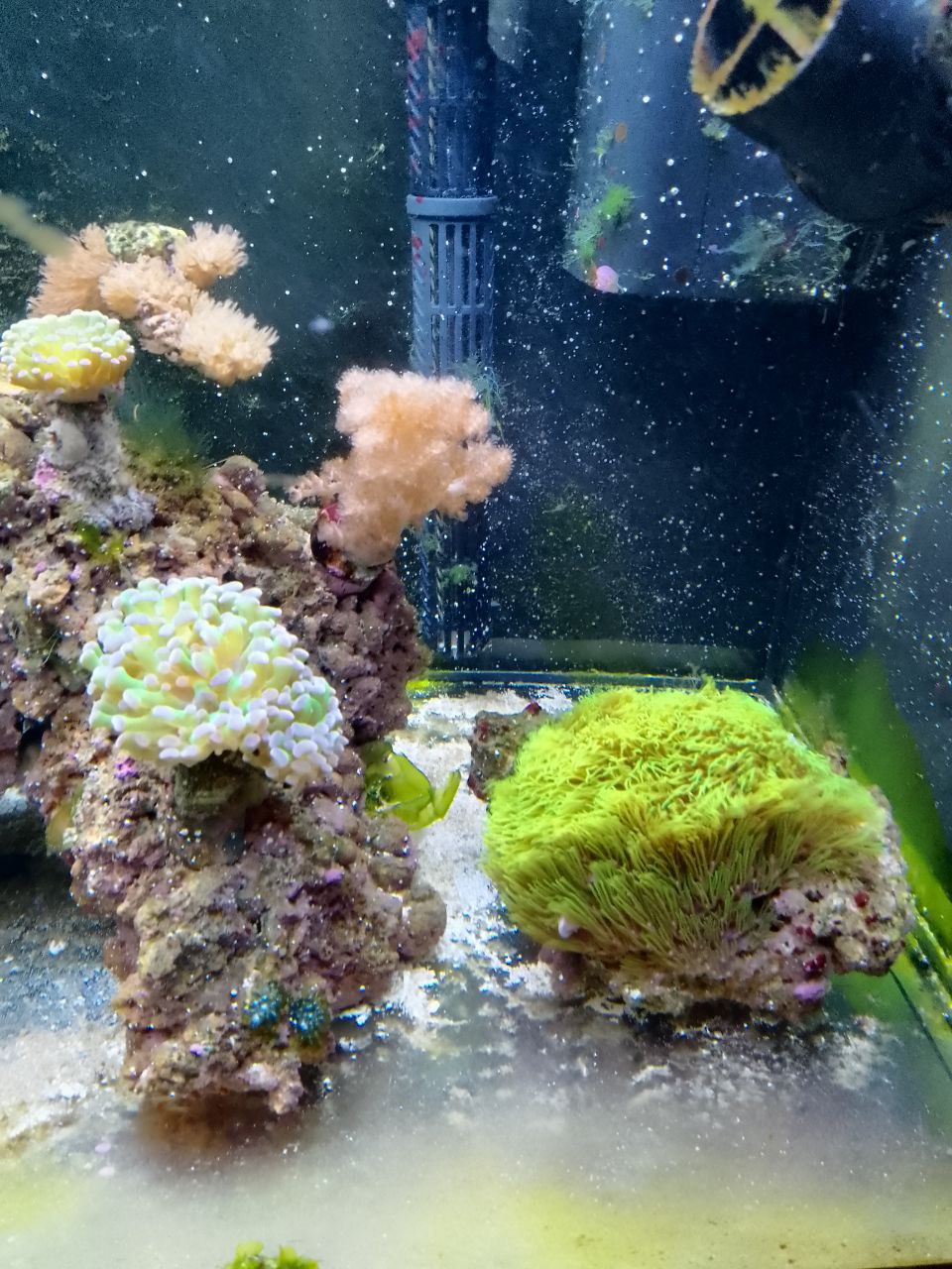 Die Korallen wachsen, nicht so extrem schnell wie es in anderen Becken möglich ist aber Sie wachsen. Auch hat sich ein sehr kleiner KH Verbrauch eingestellt. Minimal aber da, mühsam ernährt sich halt das Eichhörnchen. Kleinstschnecken die ich nie eingesetzt habe vermehren sich. Eine Art Gehäuse-Schnecke, 2 Stück, die aussehen als hätte eine graue Nacktschnecke einen Fingernägel auf den Rücken geschnallt leben auch im Becken. Die fressen auch sehr gut die Algen und sind Tag sowie Nachtaktiv, dabei sogar Recht flink.