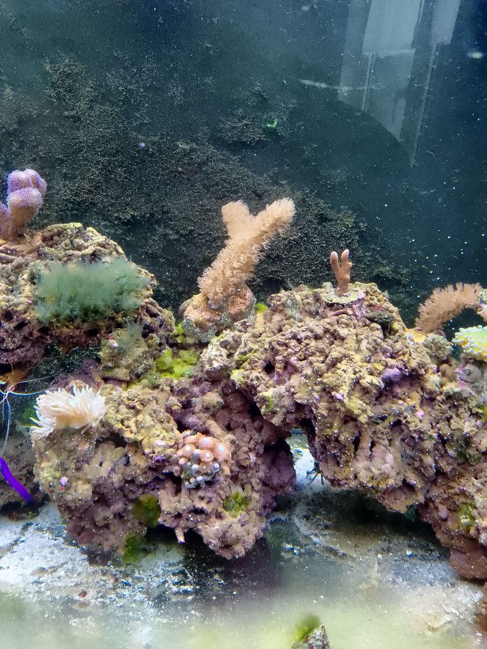Algen, darunter Kugel und Drahtalgen verbreitet sich im Becken, was einen sehr natürlichen Look erzeugt. Leider auch die Bryopsis Alge und eine die wie ein Salatblatt ausbreitet.