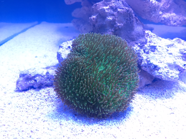 Die Sarcophyton sp. rechts auf dem Gesamtansicht Bild, habe ich vor dem Foto g'rad etwas umgesetzt, sie ist dann gleich in den Beleidigt-Modus gegangen. Insgesamt hat sie scheinbar überhaupt einen regelmäßigen "Reinigungsbedarf". Wenn sie auf ist, sie sie so aus (mit Trübung im Becken fotografiert)