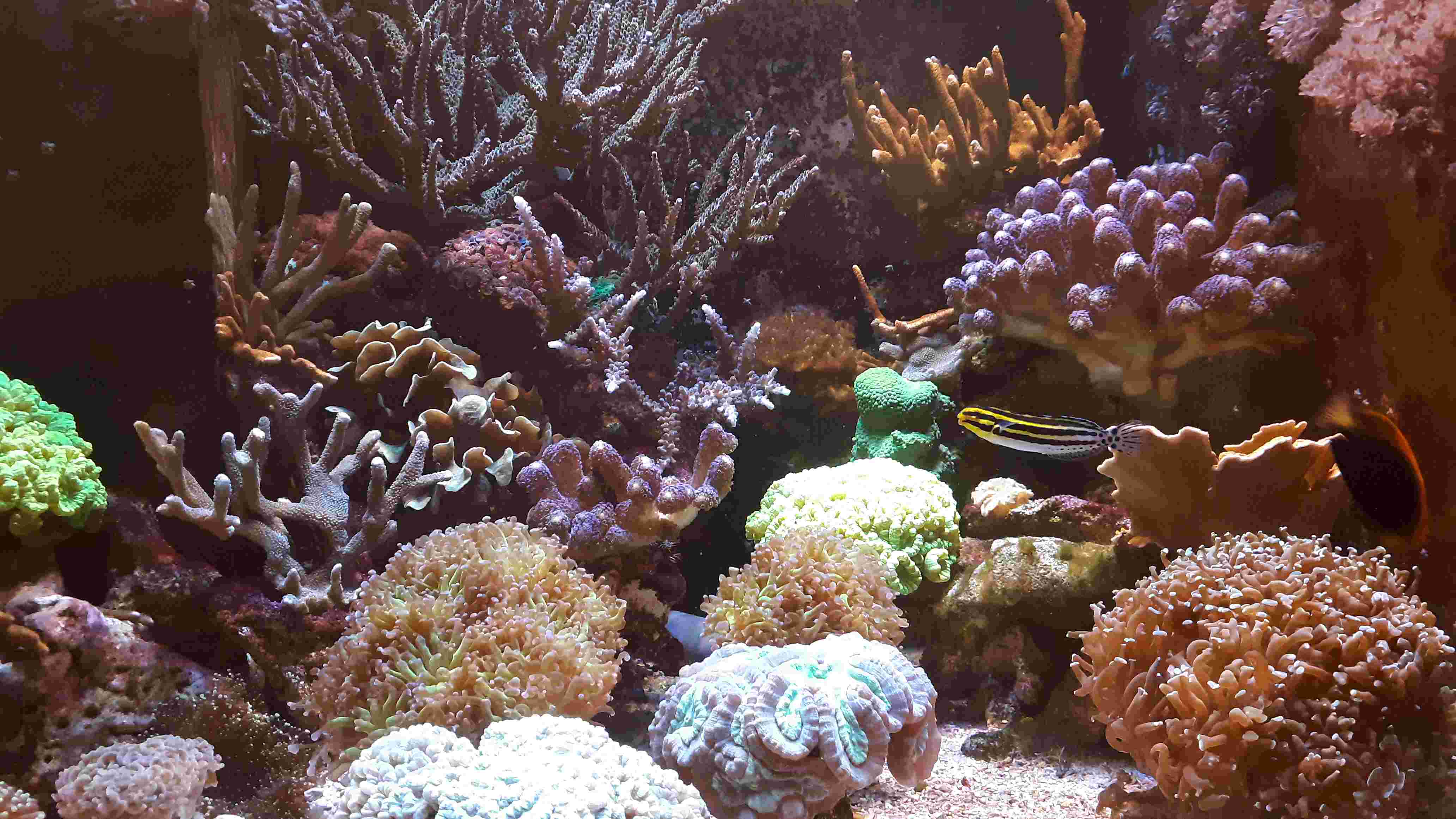 Um das Ganze abzurunden, hier mal zwei Bilder unter der Orphek. Zur Zeit ist der Kalziumverbrauch bei ca. 50% gegenüber der Hybrid. Allerdings wie oben gesagt bei nur 9 Stunden Volllast. Das wird sich sicher noch ändern.