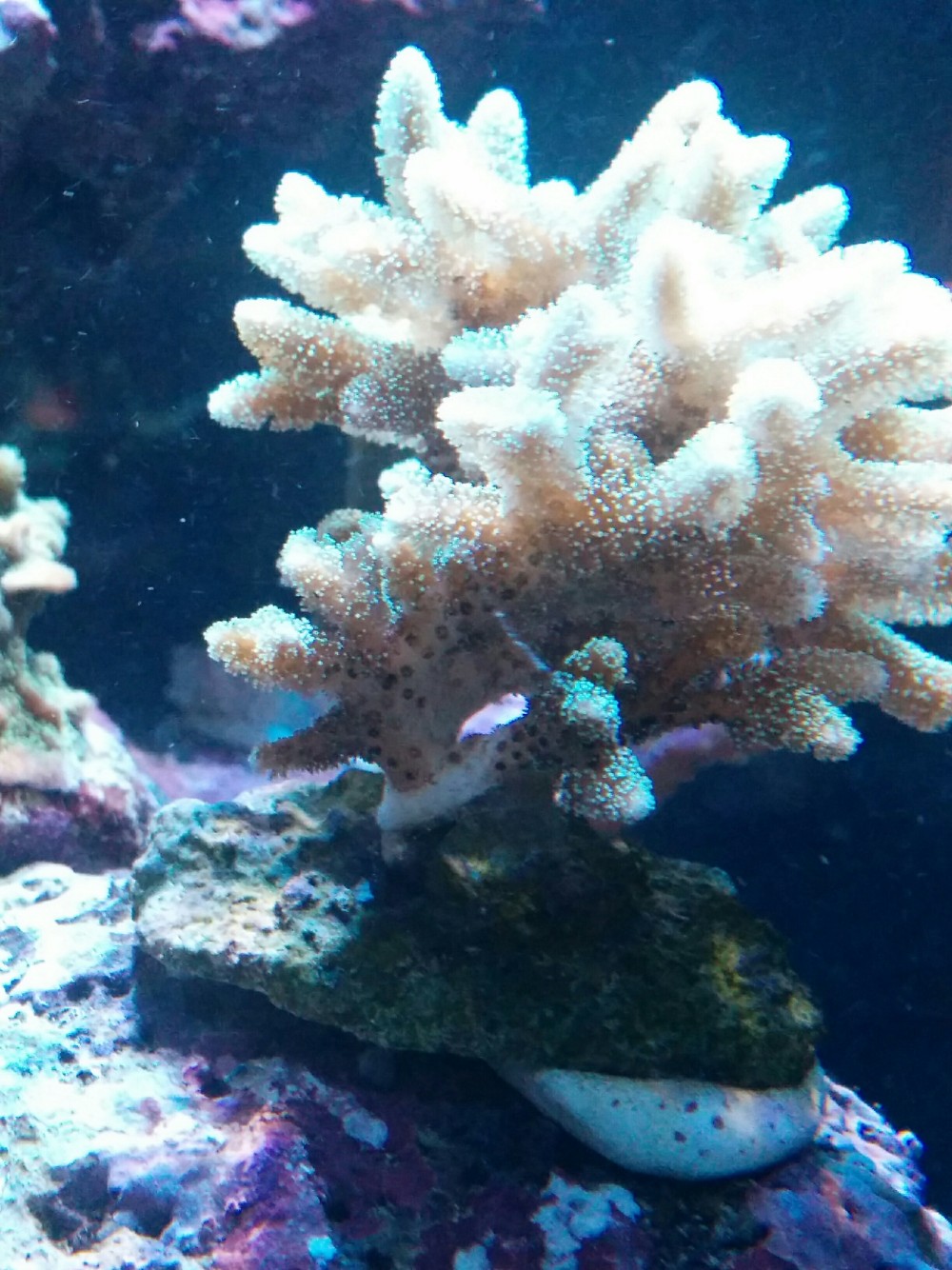 Unabhängig von diesem Problem habe ich noch ein weiteres festgestellt. Meine seriatopora caliendrum wird von unten her weiß! Alle weiteren SPS Ableger bilden derzeit fleißig Basal Scheiben, als würde ich Nährstoffmangel ausschließen. Polypenbild ist gut-sehr gut, Beströmung ist auch gut - Polypen werden geschmeidig durchgewuselt.