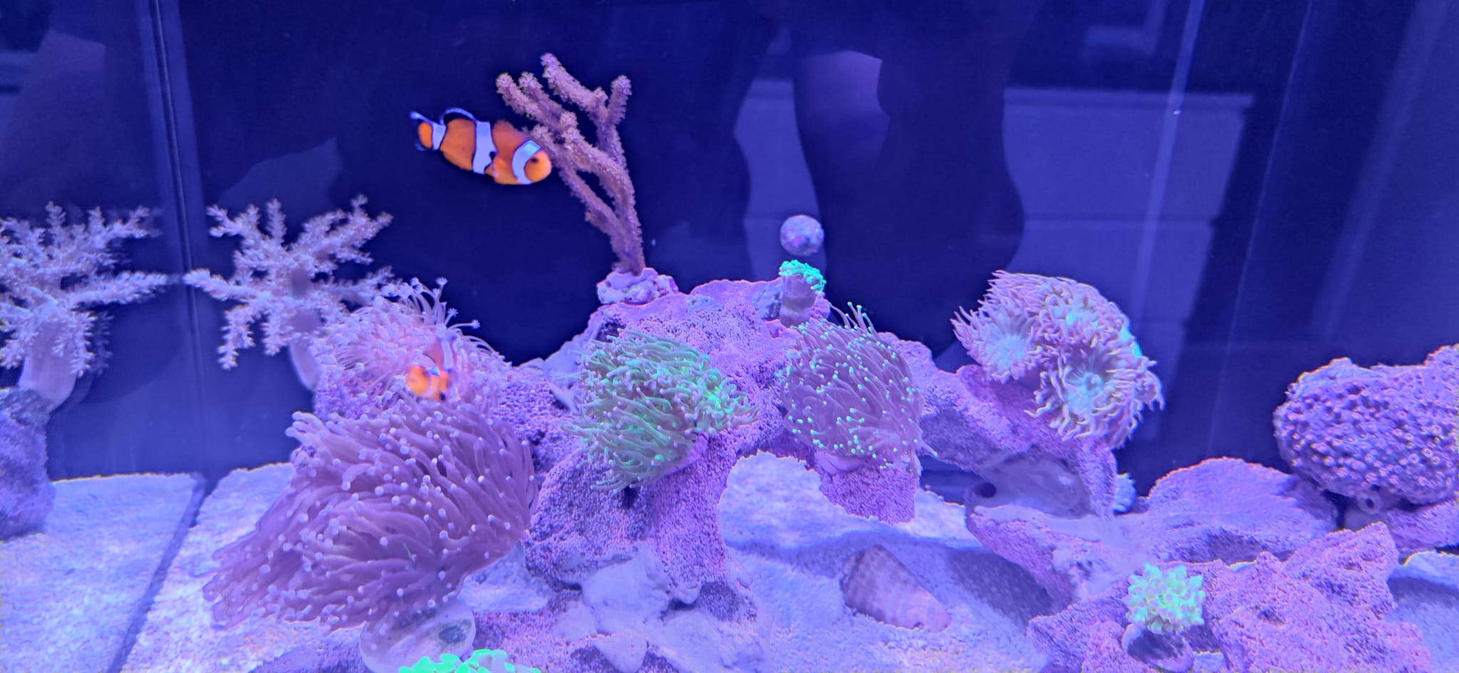 Inzwischen sind ein pärchen Grama Loreto und 2 Clownfische eingezogen. (Die Clownfische aber mit der Option auf Rückgabe wenn sie keine der Euphylien oder die Sinularia als Zuhause annehmen. Dann sollen sie woanders wohnen wo es eine Anemone gibt.)