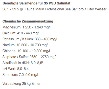 Weil ich von jeder Charge die aktuelle Analyse von Fauna Marin bekomme und die findest Du auch auf der Fauna Marin Webseite glaube ich (Nachtrag: finde ich jetzt auch nicht, aber ich arbeite mit dem Salz selbst und kenne daher die Zusammensetzung, Bor liegt im FM Salz bei 5-5,5 mg/L und das ist für den WW sehr gut geeignet, wenn Du Bor etwas anheben möchtest).Bei dem hier auf der FaunaMarin Site wird auch kein Bor angeführt. Woher weis ich beim Kauf dann ob das Salz Bor enthält?