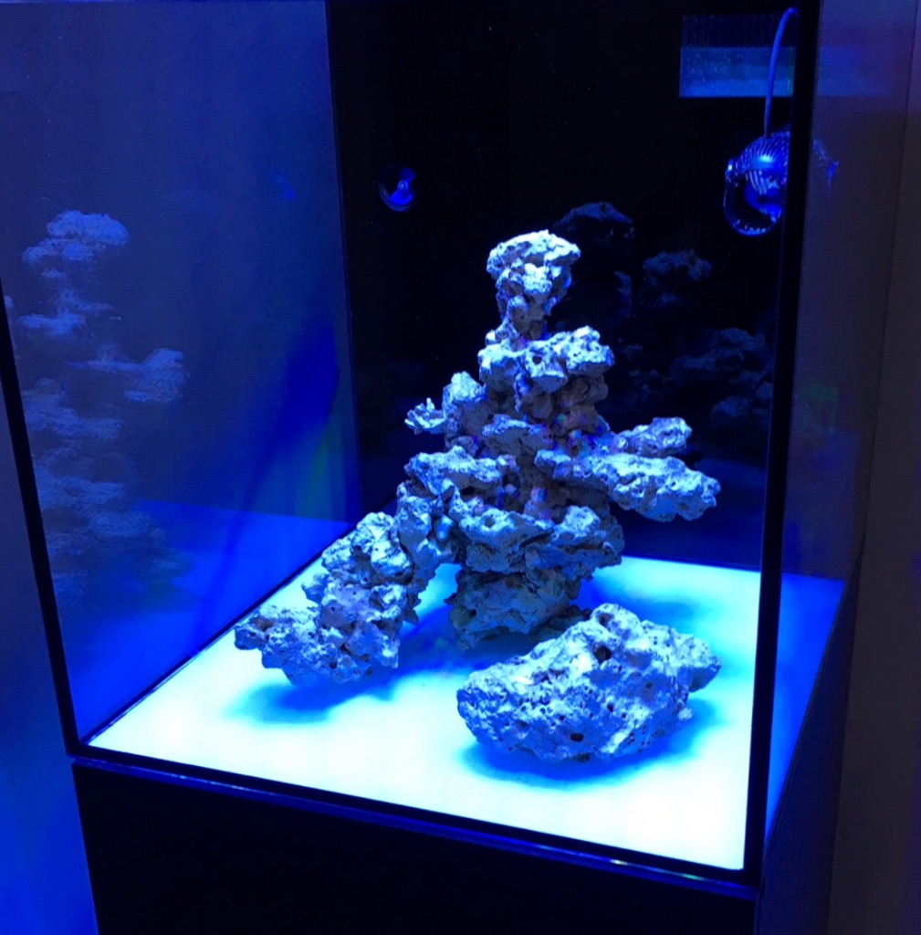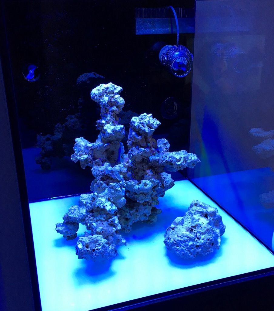 Das Becken ist ein AM Cubicus CF mit 140 160 Liter (Hauptbecken 50x60x50), der Technickbereich findet sich in einer hinteren Kammer (Technickabteil) das Technickbecken befindet sich im Unterschrank. Abgeschäumt wird dort über einen AM Turboflotor blue 500 EVO 500, betrieben mit einem DC Runner 1.3. Luftgefiltert über einen FM Skim Breeze. Kohle läuft als Dauerfilterung in einem AM über einen Hang on Filter, dem „Aquaclear 20“ multi reactor s mit. Als Rückförderpumpe dient ein Tunze Nanostream 6040 AM EcoDrift 4.2 AM DC Runner 3.3. Zur Strömung wird eine Tunze Nanostream 6055 werden zwei Al Nero 3 eingesetzt, diese wurde allerdings zu einer 6095 „wideflow“ umgebaut. Als Beleuchtung kommt eine Orphek compact V4 ATI Straton zum Einsatz.