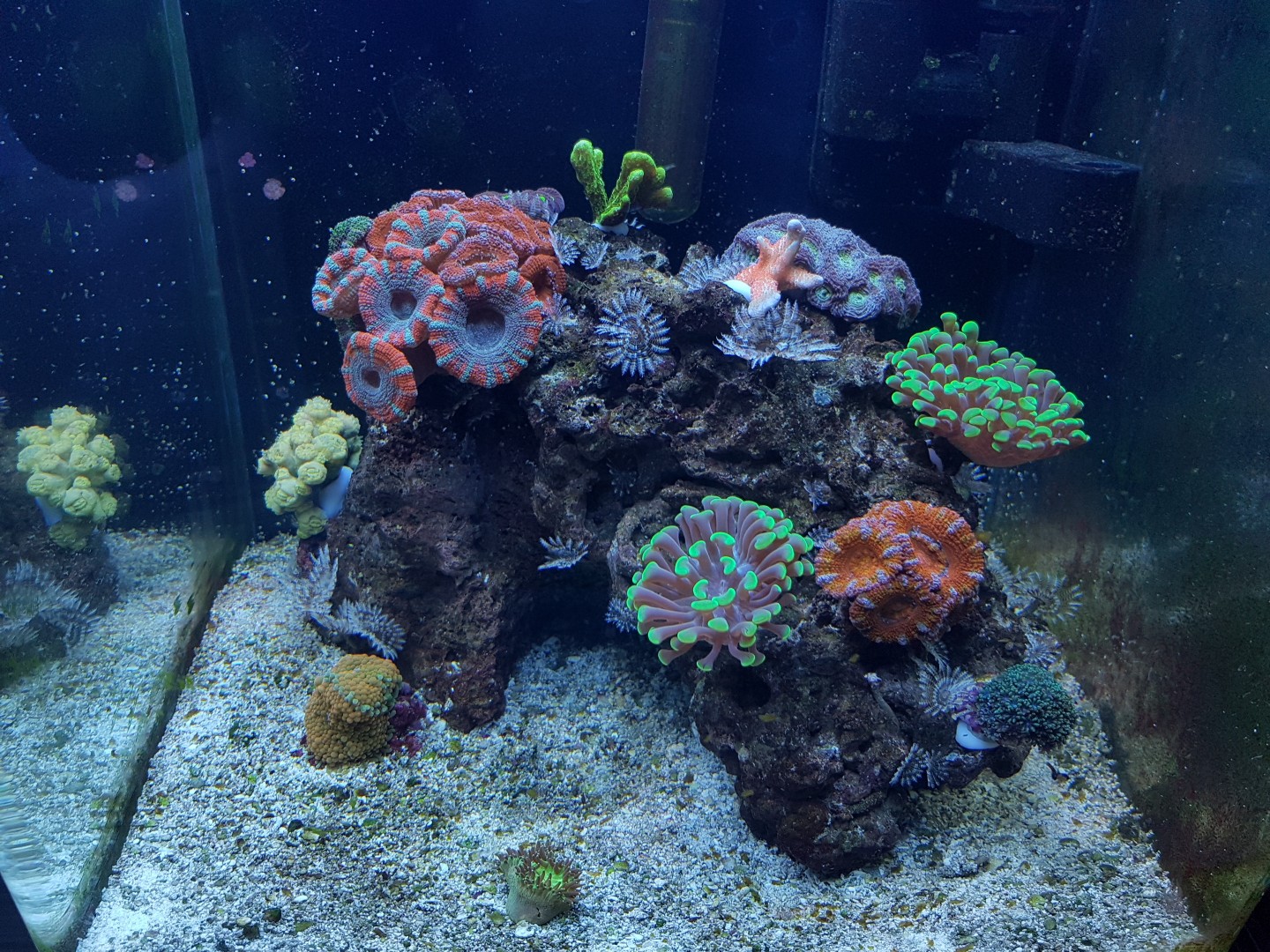 Der Aufbau ist zwar alles andere als gelungen aber meinen Korallen und den röhrenwürmern gefallen die 2 Brocken LS. Und ich hoffe dass die ministückchen SPS, sofern sie erst mal wachsen, ihr übriges tun um den Nano einen ansehnliches Aussehen zu geben.