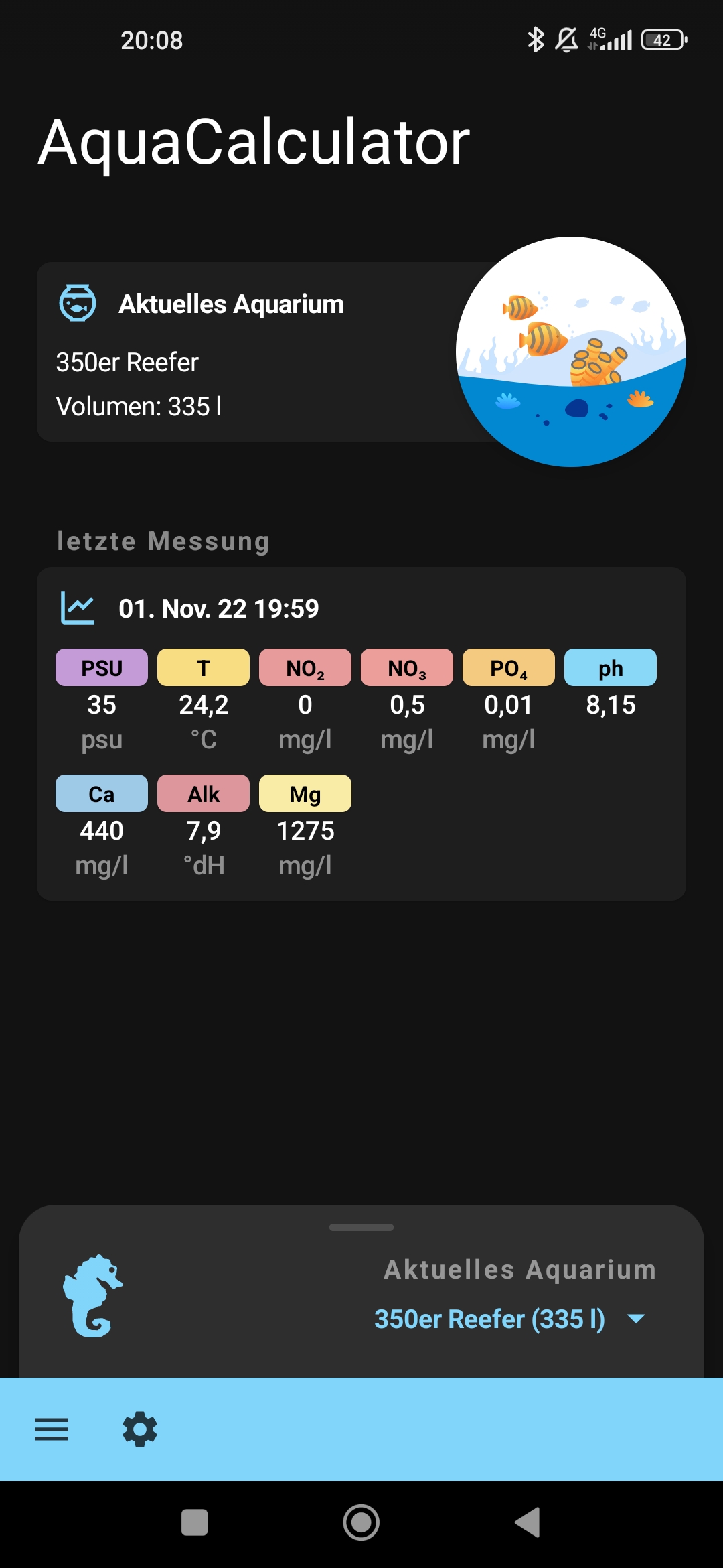 Gestern lt. Anleitung auf 20PSU und dann weiter auf 35 aufgesalzen. Rein rechnerisch habe ich somit ein Nettovolumen von 345l