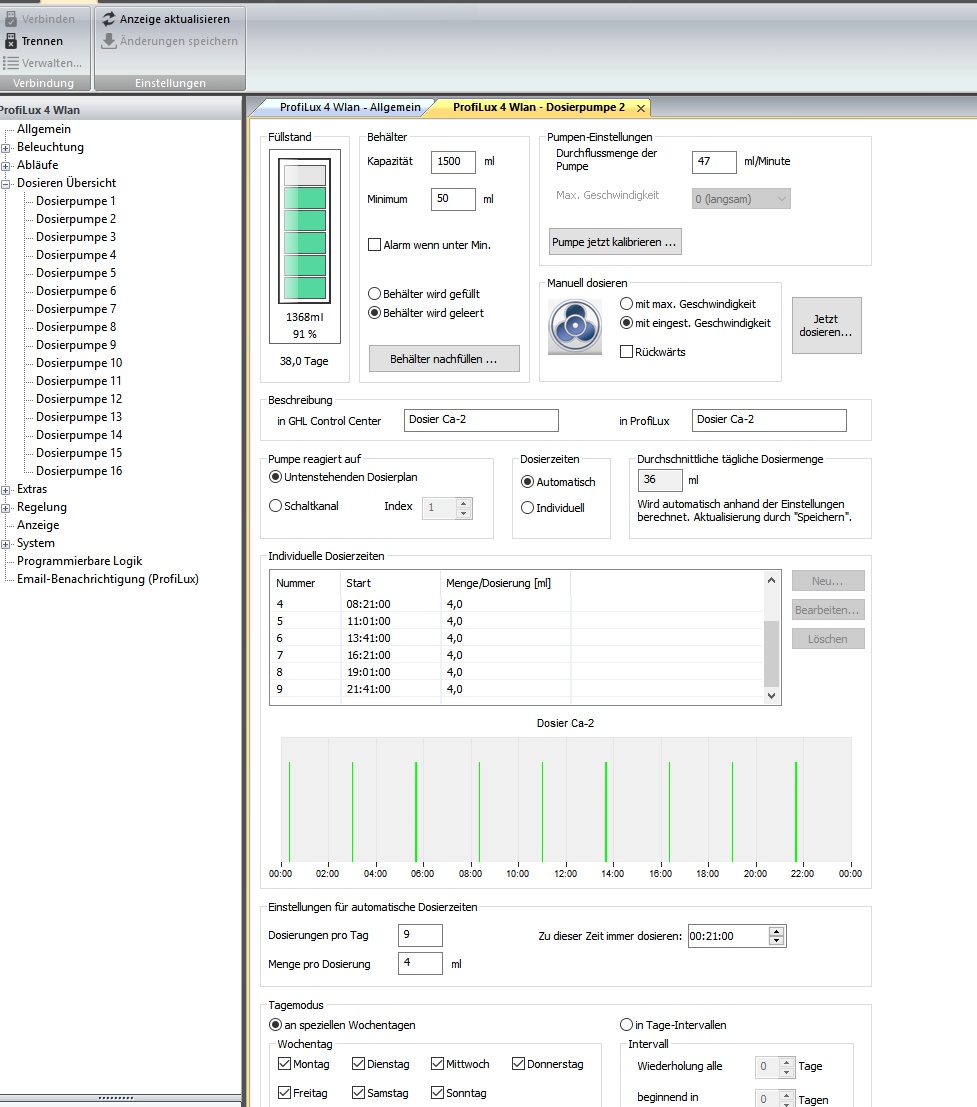 Nein. Wie oben in der Übersicht zu sehen, wird eingegebn was drin ist. Ca1 und Ca2 sind gleich eingestellt. Dosiert über den Tag 9 x 4ml.