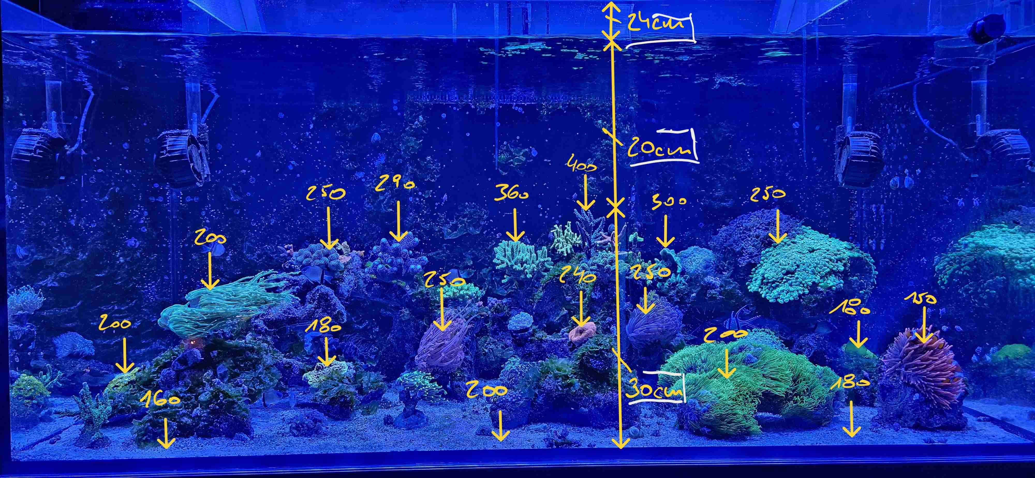 Im Keller habe ich über dem Ablegerbecken (LxBxH 50x50x50cm) 2Stk. von den Kessil A160 drüber, mit denen ich ebenfalls sehr zufrieden bin, die aber mit nur 40W je Leuchte zu schwach für das Becken sind.