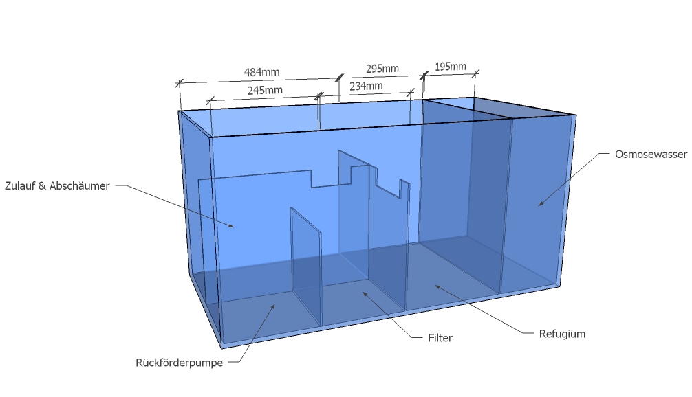 In den Sinne macht das Refugium keinen Sinn. Ein Refugium müsste untrennbar sein, so dass es autonom betrieben werden könnte. So ist es eine Filterkammer welche Du ggf. für Wasser Wechsel benutzen könntest... oder für Filter (sich wenn Du schon eine dafür geplant hast... Du könntest diese auch weglassen.