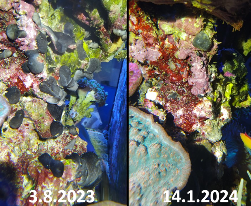 Diese Schnecke hat bei mir sehr gute Arbeit geleistet und schon ein großen Anteil dieser schwarzen Schwämme innerhalb von 4 Monaten gefressen. Das folgende Bild stellt einen Vorher Nachher Vergleich an derselben Stelle im Riffaufbau dar. Linke Seite wurde am 3.8.2023 und die rechte Seite am 14.1.2024 aufgenommen. Den Unterscheid sieht man deutlich.
