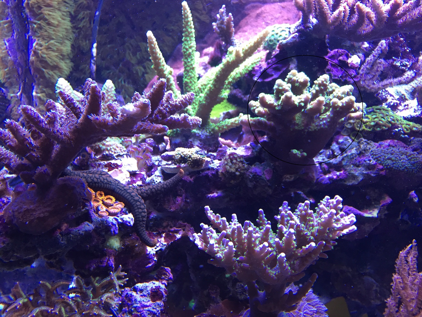 es handelt sich um die Koralle, welche ich auf dem Bild markiert habe. Ich weiss nicht recht, was es für eine ist. Ich denke allerdings, für eine Acropora-Krabbe ist die nix. Lippi ist so ein Ding - mein Becken ist offen und diese Fische springen gern.