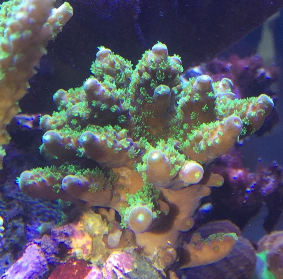 Allerdings glaube ich inzwischen eher wieder, dass es sich um ein anderes Problem bei dem Tier handelt. Die Koralle ist ziemlich dicht gewachsen und steht etwas im Strömungsschatten. Möglicherweise liegt es an zu wenig Strömung in diesen Bereichen? Die Acro hat zeigt immer wieder solche Stellen.
