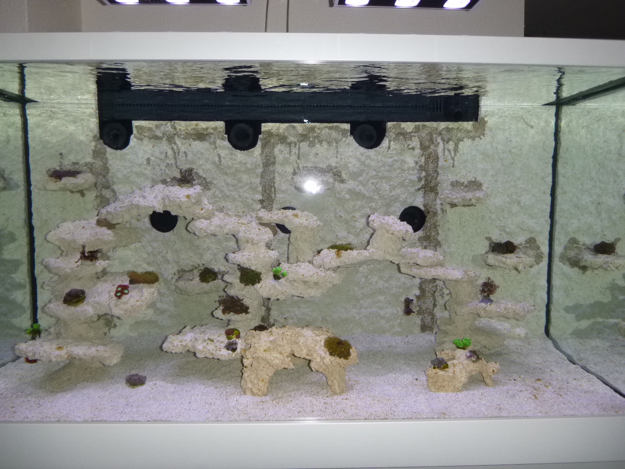 Die Beläge sind seit zwei Tagen zu sehen, da lief das Becken genau eine Woche und einen Tag, anfangs nur zwei Pünktchen und dann immer mehr werdend. Die Beläge sind NUR im Licht und auch auf senkrechten Flächen und oben stärker als auf waagerechten Flächen und am Boden, also auf jeden Fall mal lichtabhängig.