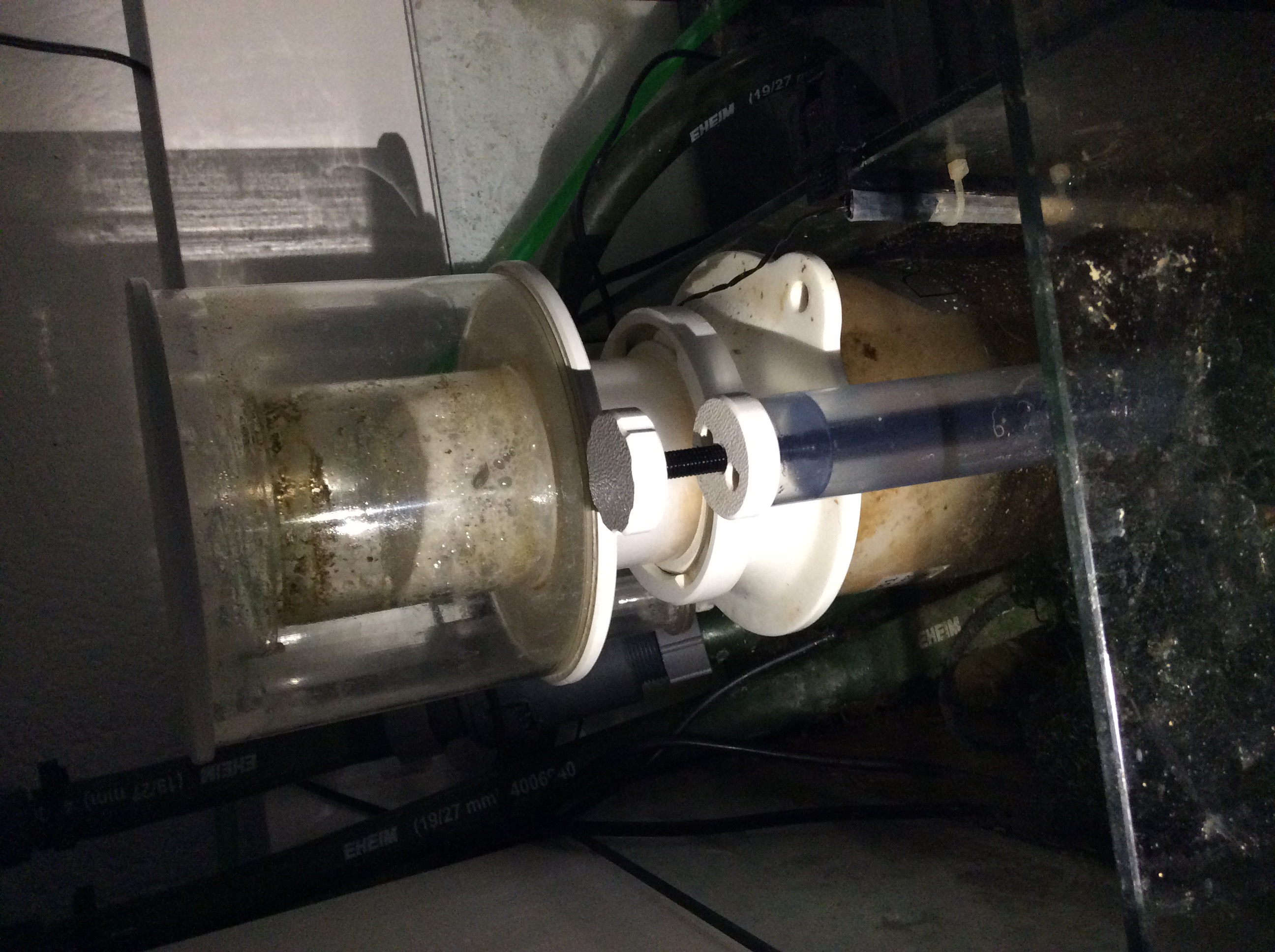 Einstellung Abschäumer steht momentan auf 5 von 10 und Blasenbildung begingt beim Schaumtopfboden. Auf dem Bild ist er gerade sauber gemacht worden. Das abgeschäumte Wasser ist dunkelbraun.