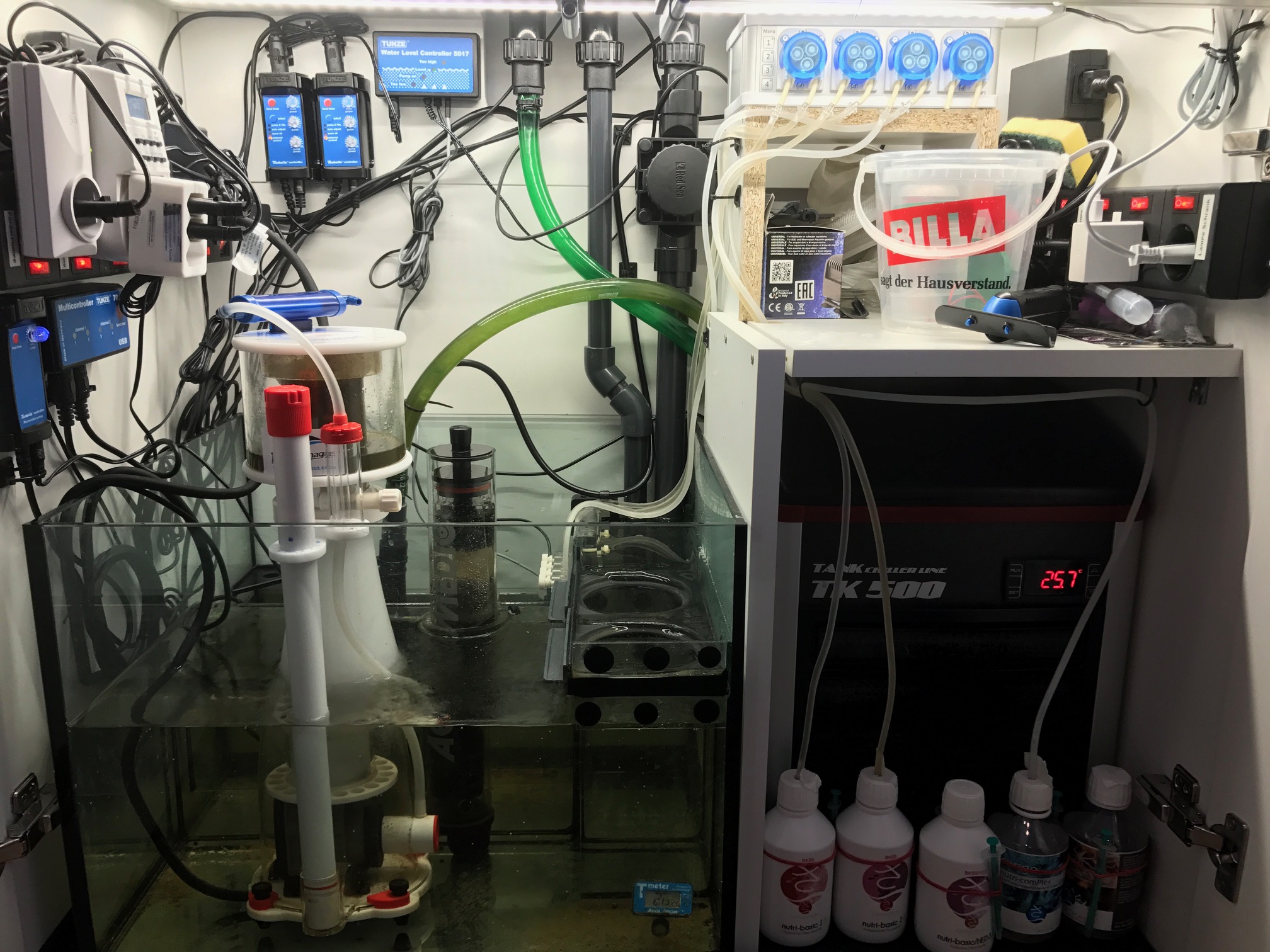 Die Dosierung erfolgt in die Kammer der Rückförderpumpe, also nach der Aktivkohle und dem Abschäumer!