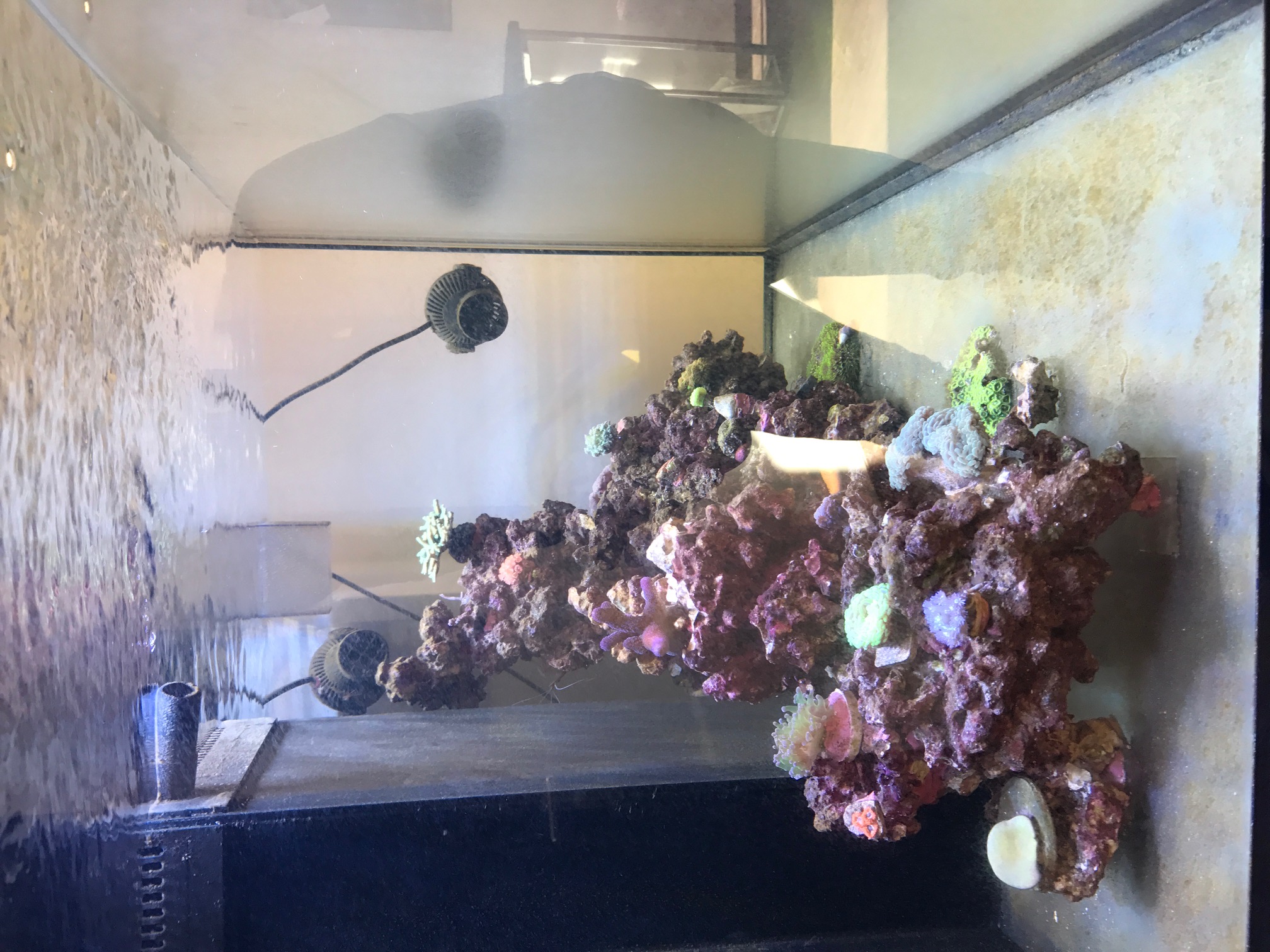 Vor einer Woche habe ich den Riffaufbau mit 1-2 kg Real Reef Rock erweitert um mehr Platz für weitere Korallen zu haben. Auf genau diesem Stein bilden sich jetzt wieder die Algen mit denen ich kämpfe. Es ist der rechte Teil und die Säule darunter...