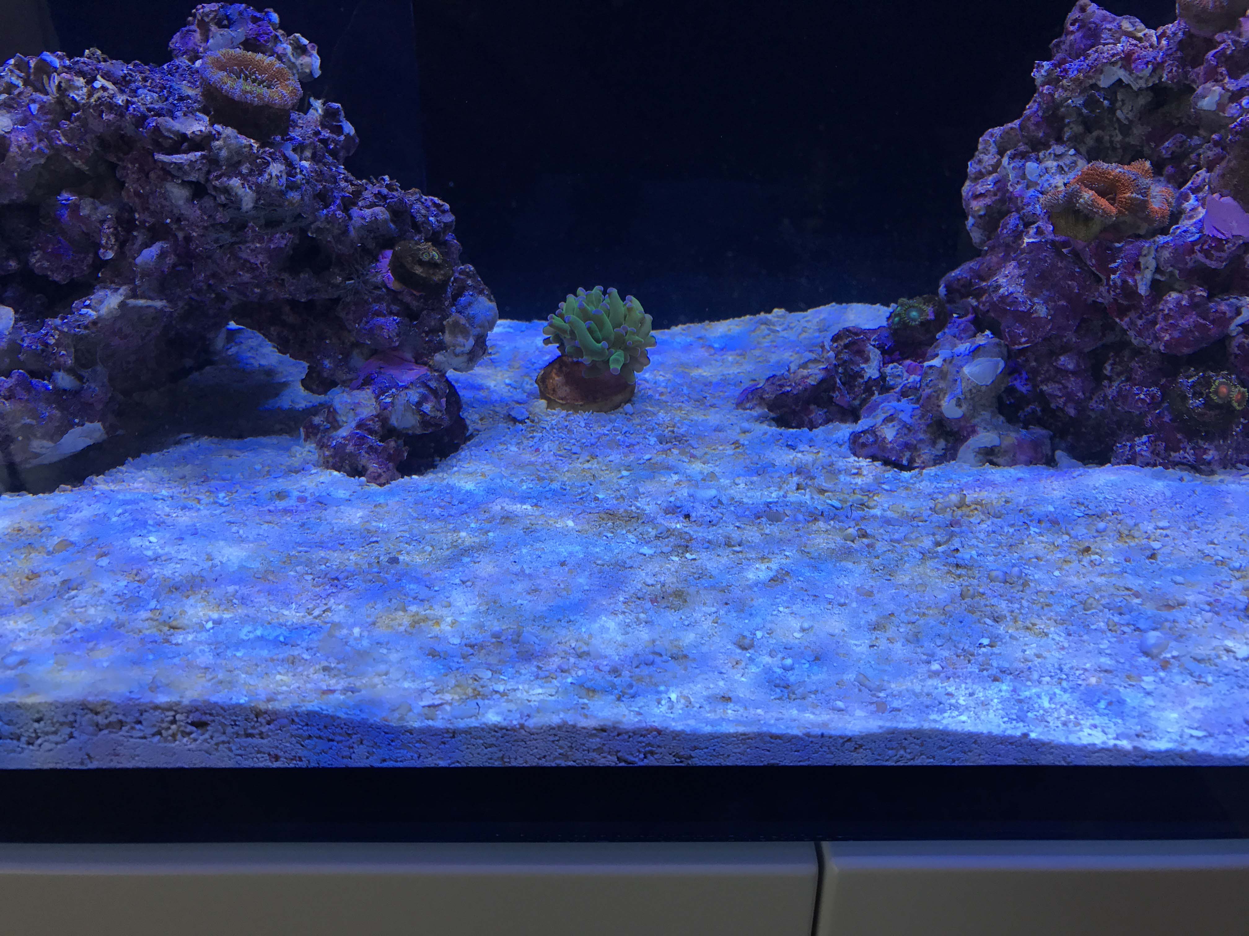 So, die Kieselalgen sind weniger geworden und etwas grüne Algen sind dazu gekommen, auch an den Scheiben. Die Krustenanemonen sind mittlerweile wieder schön offen.