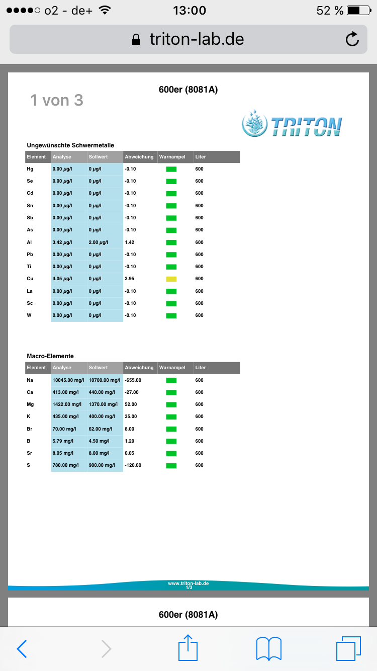 Wie gesagt habe ich in letzter Zeit Einzelelemente über Triton angepasst. Ich hänge Euch deshalb mal meine letzte Analyse von vor einer Woche und auch meine derzeitigen wöchentlichen Dosierungen anbei. PO4 war etwas höher, da Absorber erschöpft, habe ich eigentlich immer gerne unter 0,02.